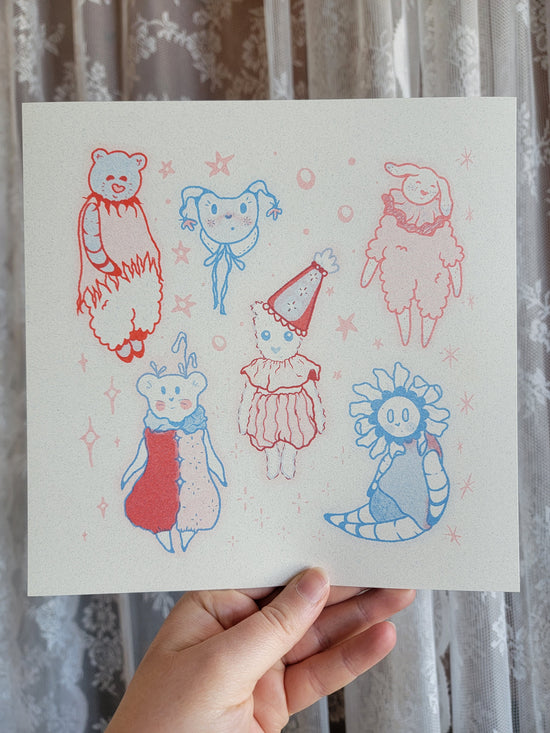 8x8 riso in red and cornflower blue of six lil guys by @lemon.droop