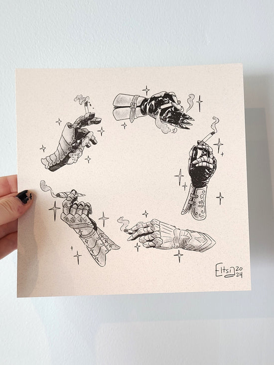 8in by 8in riso print in black of a circle of gauntlets holding cigarettes by @eltsian