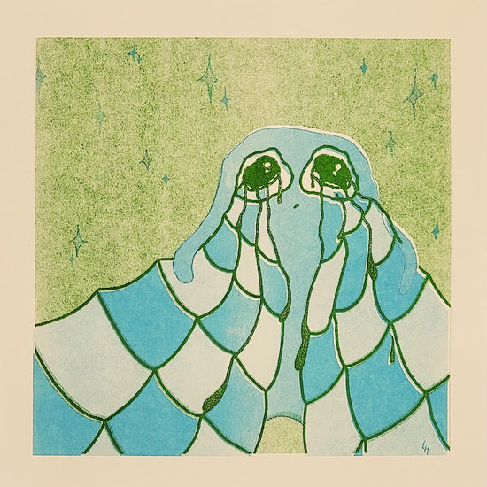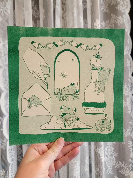 8in by 8in riso printed in green by @lemon.droop