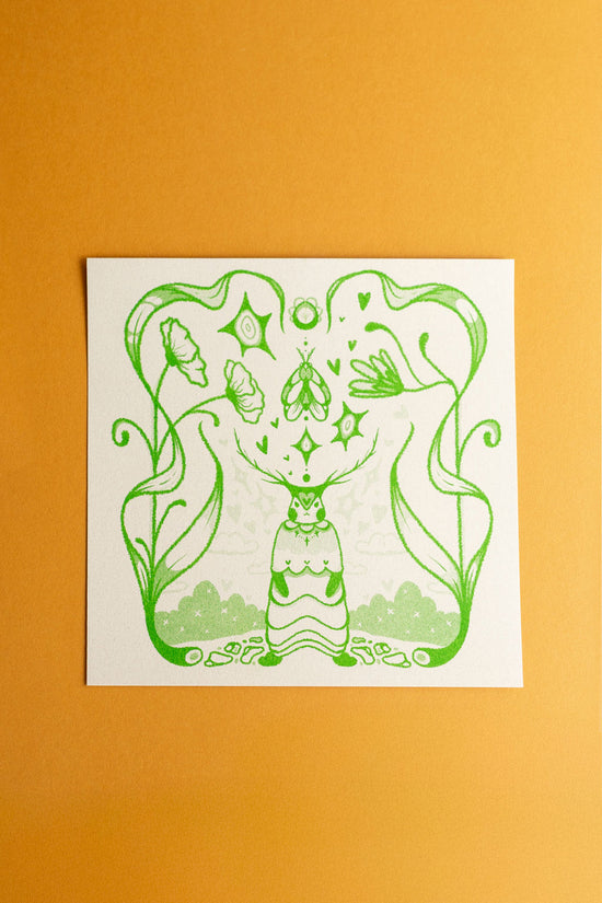 8x8 riso in kelly green of a magical critter protecting a pathway they care for dearly by @lemon.droop
