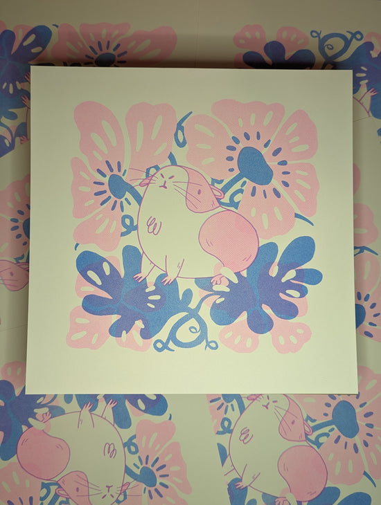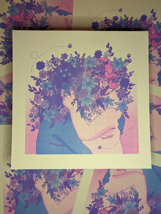 11x11 fluo pink and cornflower riso print for the Hope Blooms gallery show by @pewter.bee