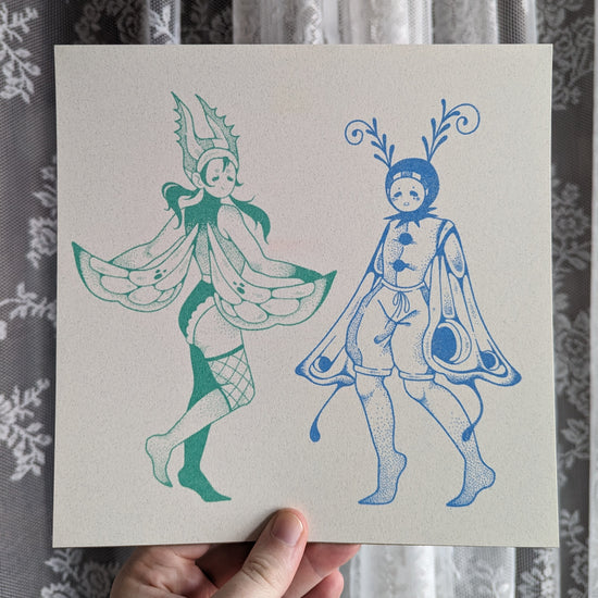 8x8in seafoam and cornflower riso print of two bug clowns by @haunted.heirloom