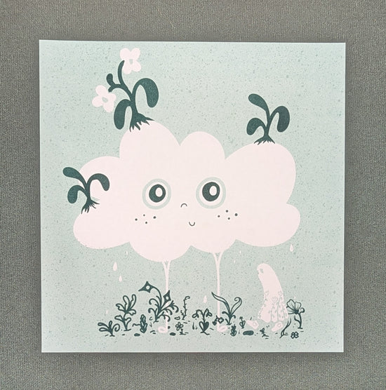 8x8 riso in seafoam and hunter green depicting a lil ghosty walking underneath a large an happy raincloud through a growing meadow by @lemon.droop