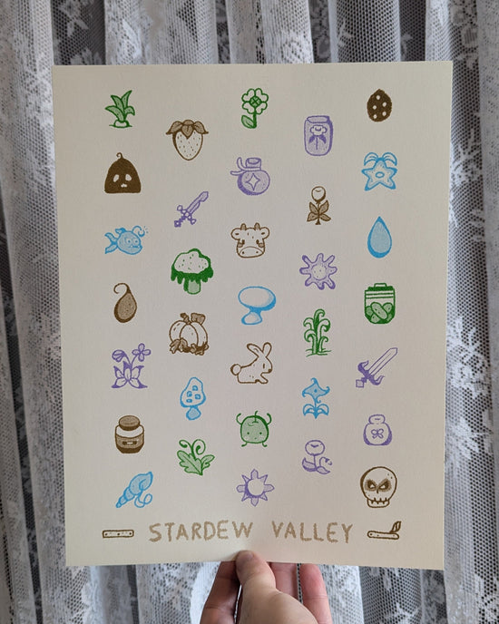 aqua, flat gold, kelly green, lilac riso depicting 33 of the things you can expect to find on your Stardew Valley digital adventure by @lemon.droop