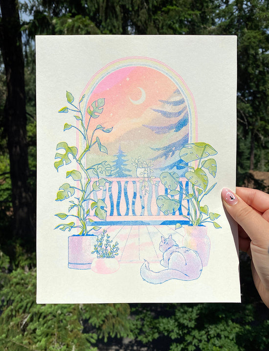 8.5"x11" risograph print of a beautiful landscape from a plant (and cat) filled balcony by @cassiegenc