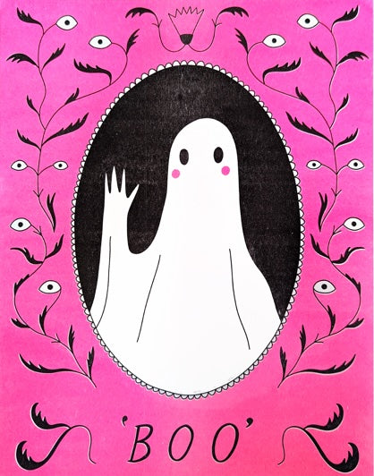 5in by 5in risog greeting card printed in fluorescent pink by @lemon.droop