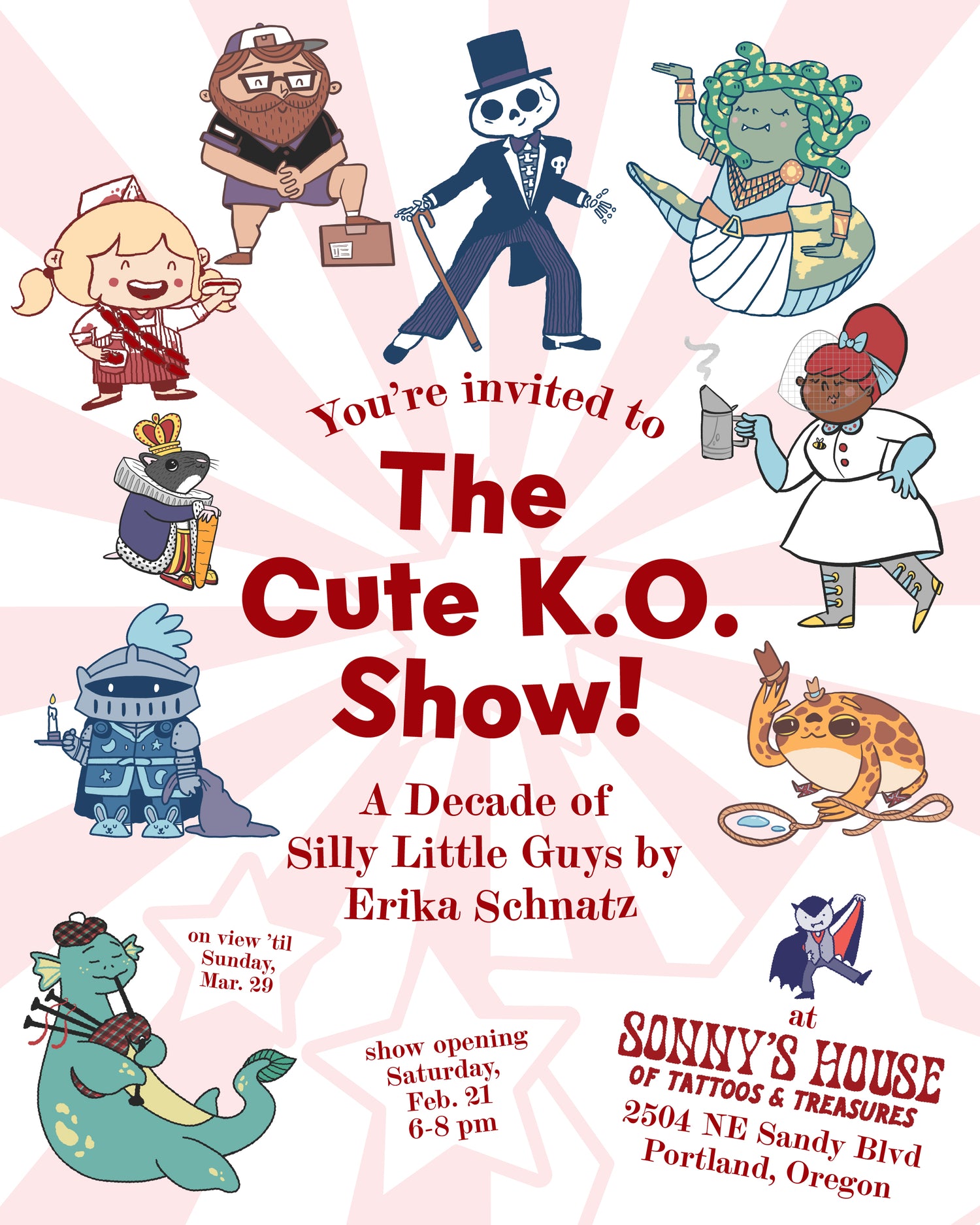 Cuties of all kinds are welcome to Cute K.O. Show, celebrating a decade of silly little guys created by Erika Schnatz! Back in spring of 2017, Erika launched Cute K.O., a tournament of cuteness populated by original characters. Via various social media platforms and in-person events, folks vote for their favorites in head-to-head matchups, and the tournament concludes when one cutie remains. To commemorate the milestone, year ten is a tournament of champions bracket, where top characters from the past four years will return to vie for a championship title. Come by Sonny’s House to view a gallery wall full of original mini pieces, vote in round one of Cute K.O. 2026, and pick up some merch of your favorite little guy.