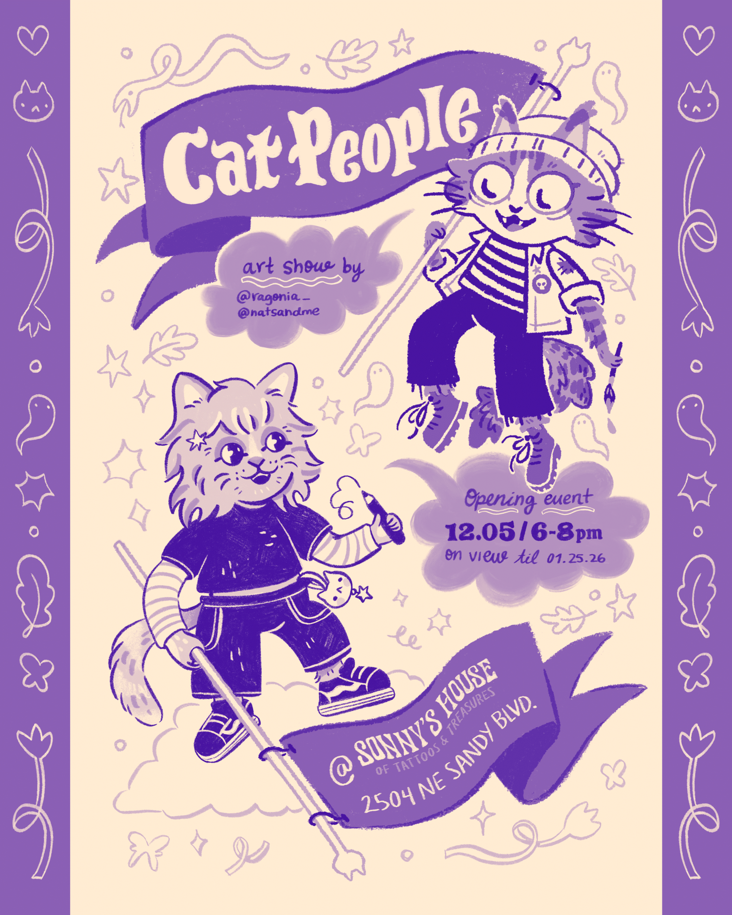 Calling all Cat People! Come glimpse into a feline world of fantasy and whimsy, illustrated by Ragon and Natalia. A special gallery show dedicated to our favorite furry roommates, and the concept that they ought to get out there and put themselves into our shoes, hats & scarves, to embark on some fun adventures. Come, ogle, and even adopt some original costumed cat art to brighten up your home this winter (you got room for another cat, don’t you?)