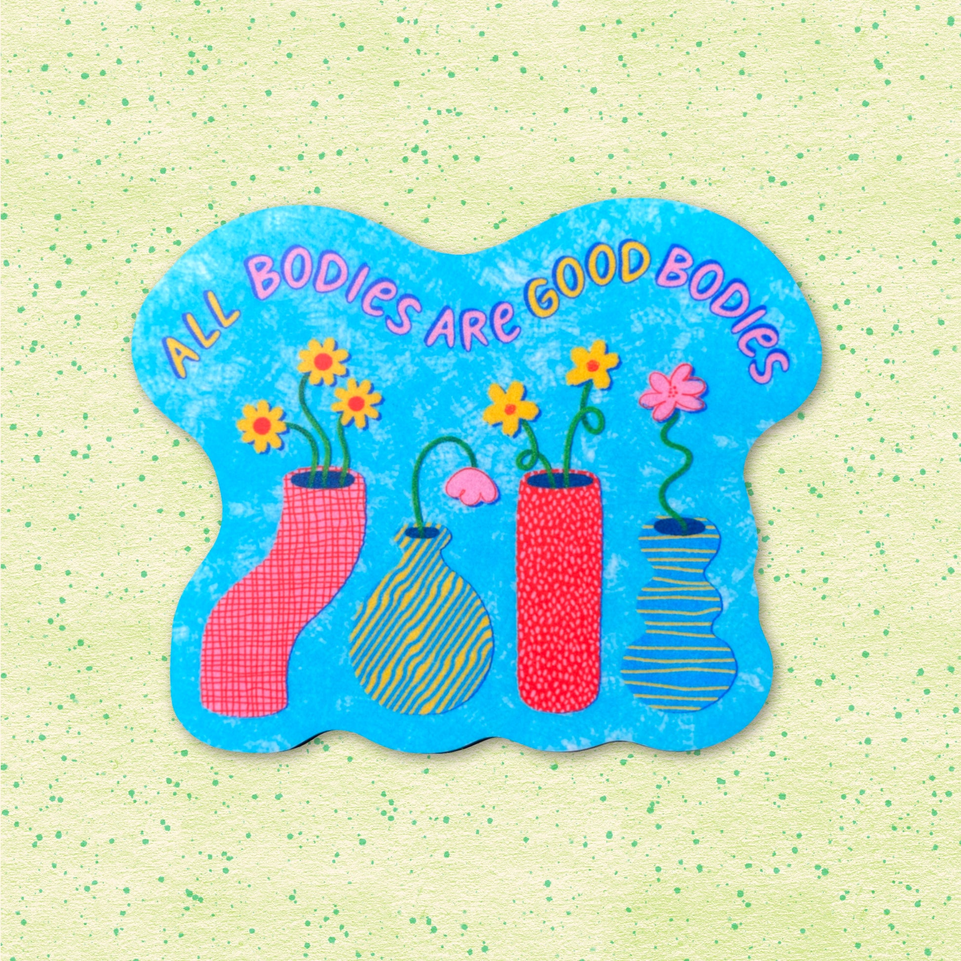 All bodies including and especially trans bodies, fat bodies, bipoc bodies, and disabled bodies are special, sacred and deserving of respect! Remember to be kind to yourself, take care of your lovely body, and support those in need around you! 3.13” x 2.54" Matte sticker! Weatherproof & Waterproof. Printed locally in Portland, OR by Sticker Ninja.