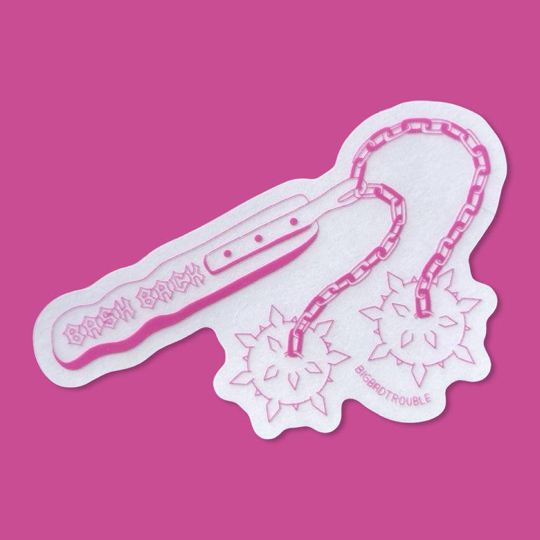 frosted matte sticker with pink flail with "bash back" on the handle