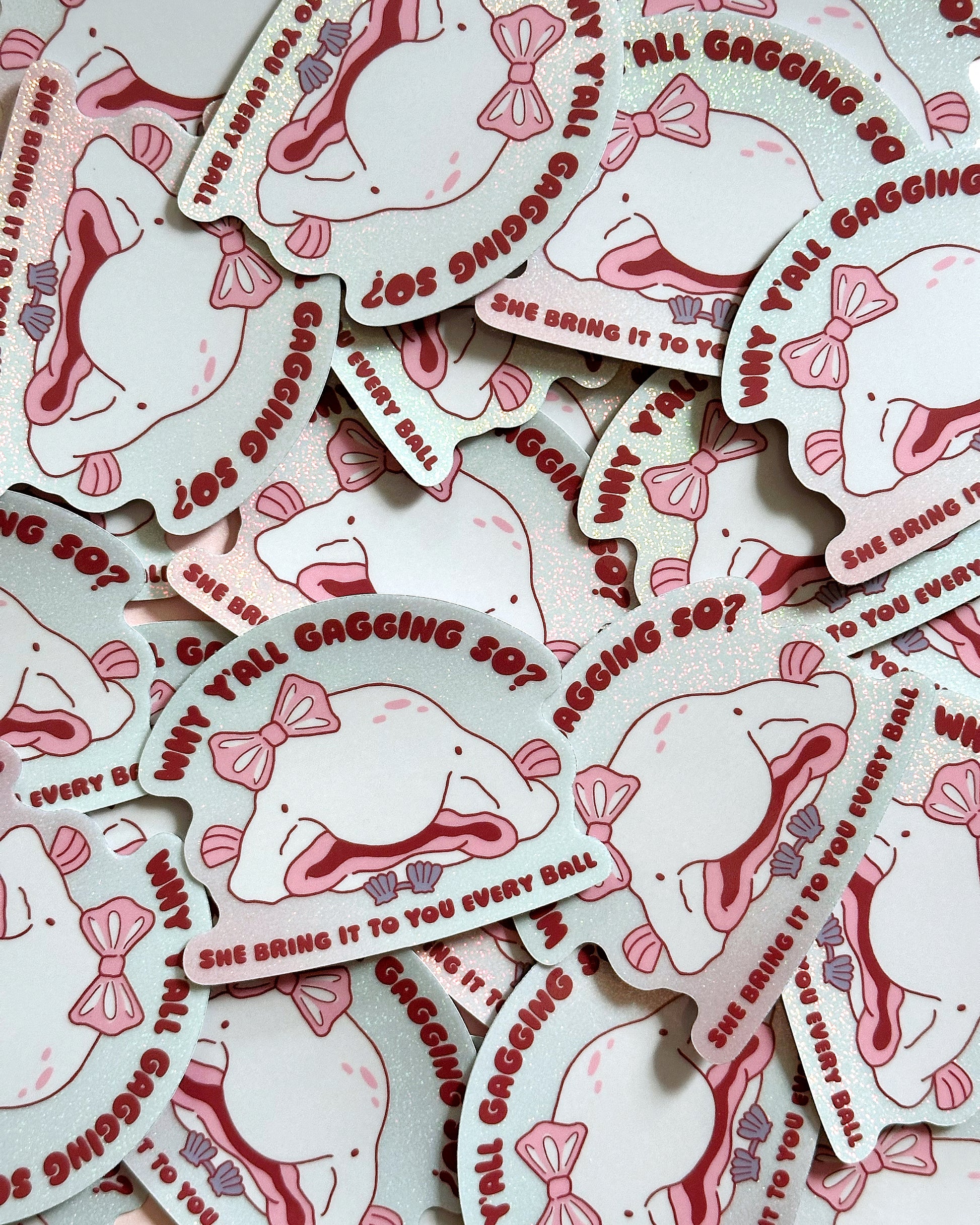 Fans of blobfishes and ball culture will enjoy this subtly sparkly 3.5” sticker featuring Cute K.O. 2018 competitor Blobfish Betty and the text “Why y’all gagging so? She bring it to you every ball.” These stickers are UV protected for up to three years of outdoor use and are waterproof – perfect for that thermos or water bottle you run through the dishwasher.