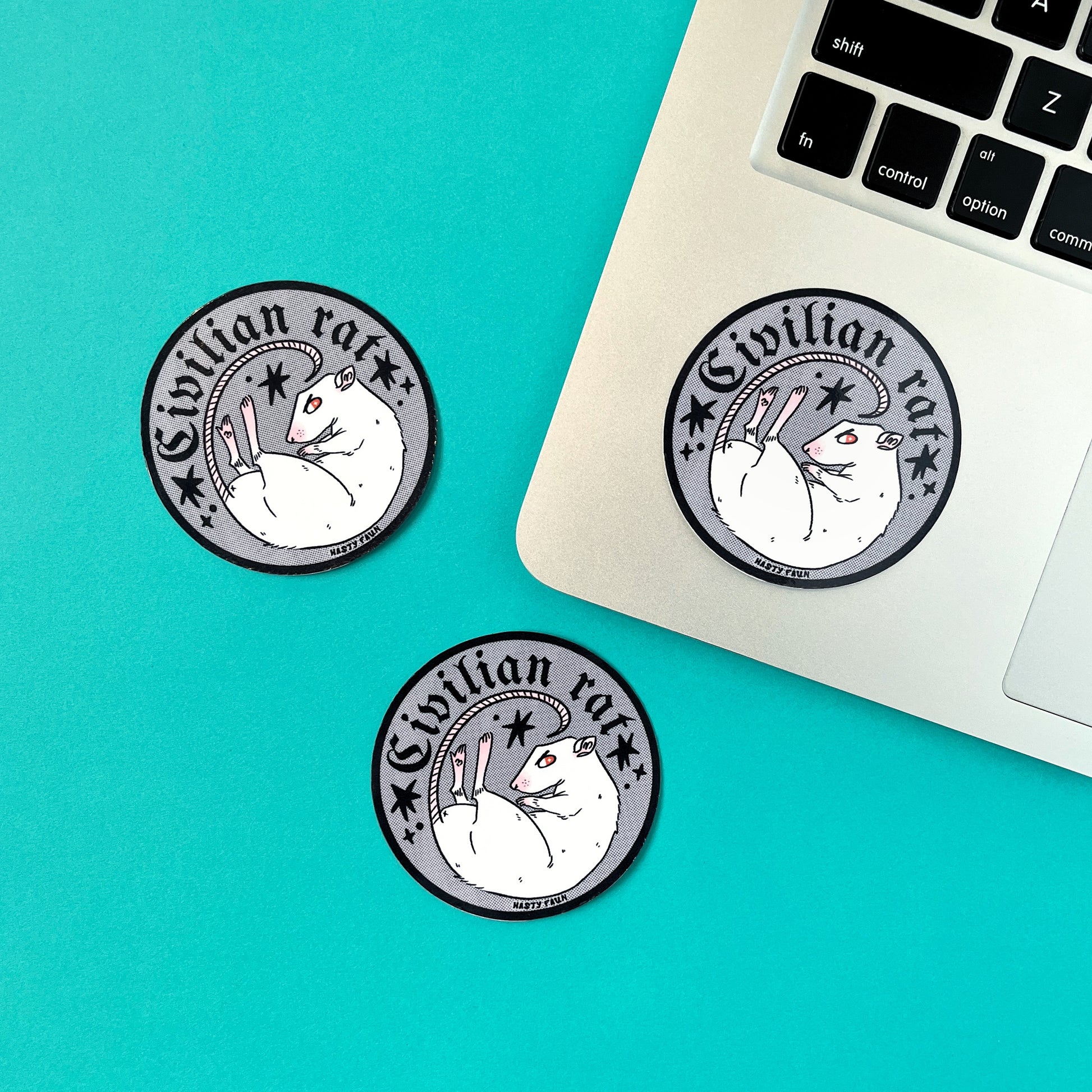 A vinyl-laminated, illustrated sticker. This sticker is waterproof but not recommended for outdoor use. Size: 2.5" x 2.5"