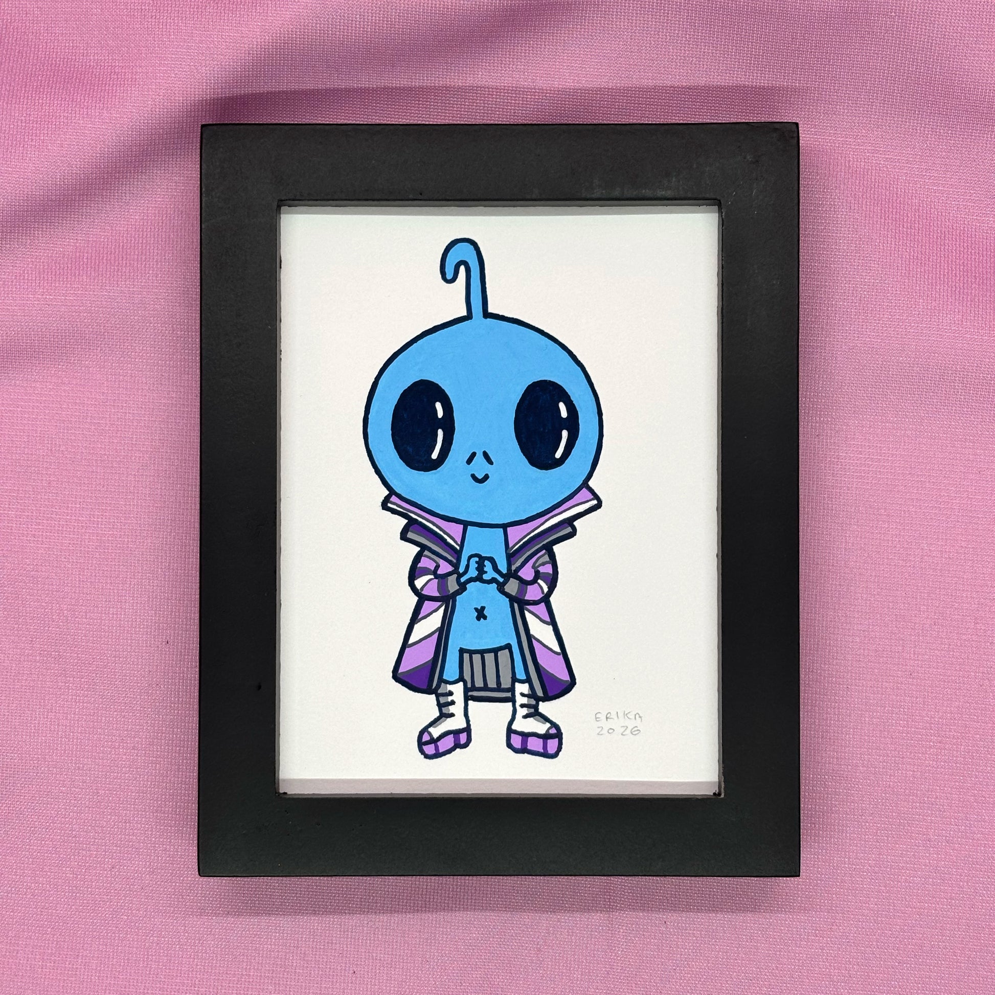 Posca paint pens on vellum bristol board of Cute K.O. 2024 competitor Claude the alien. Measures 3" x 4" unframed, 3.75" x 4.75" framed