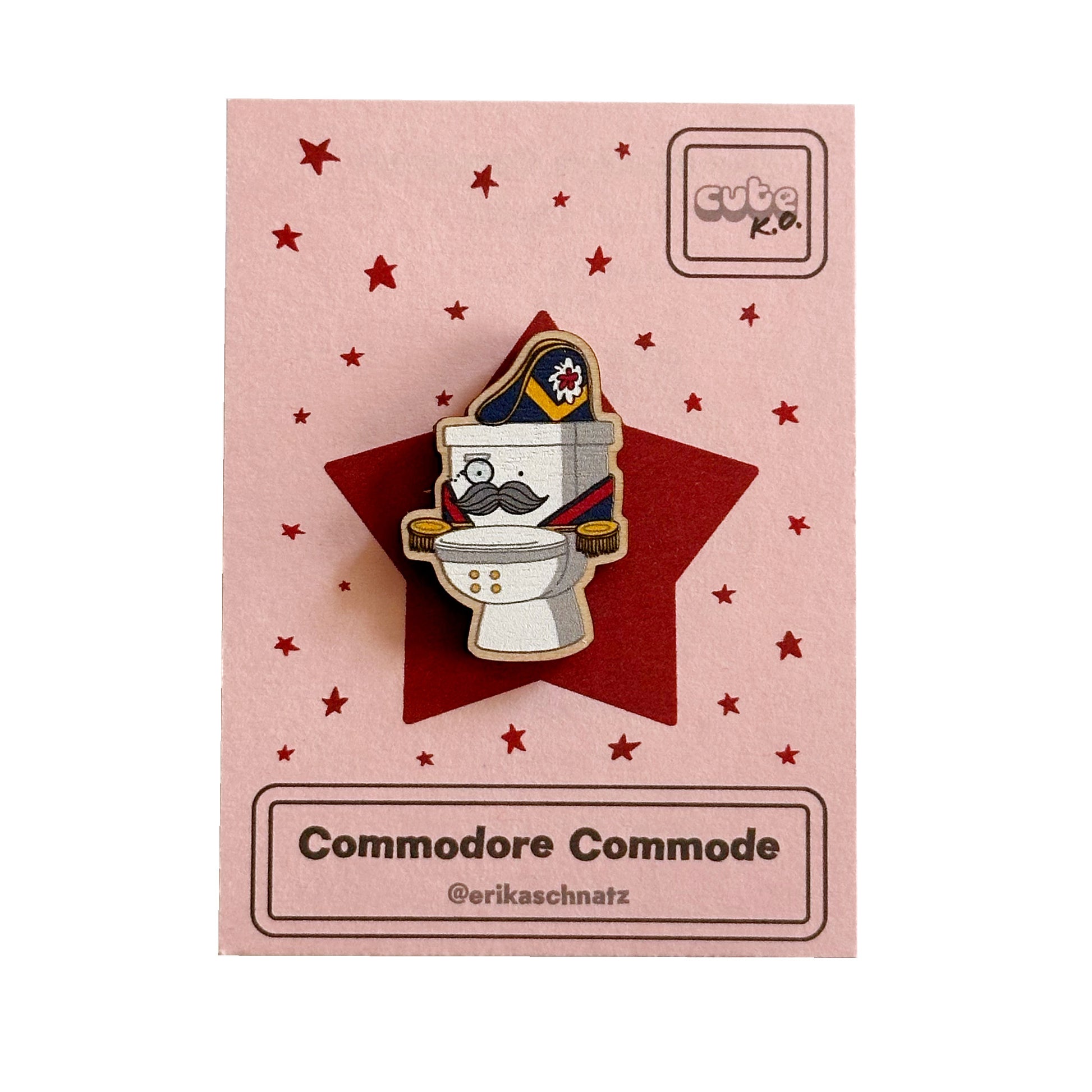 It’s 2025 Cute K.O. competitor Commodore Commode in his finest naval regalia! This 1.5” full-color custom-printed wooden pin is made from responsibly sourced, fast-growing maple veneered MDF. It’s .125” thick and has a white star-shaped rubber backer for extra cuteness. Backed by a star-covered card on pink cardstock with Commodore Commode facts on the card back!