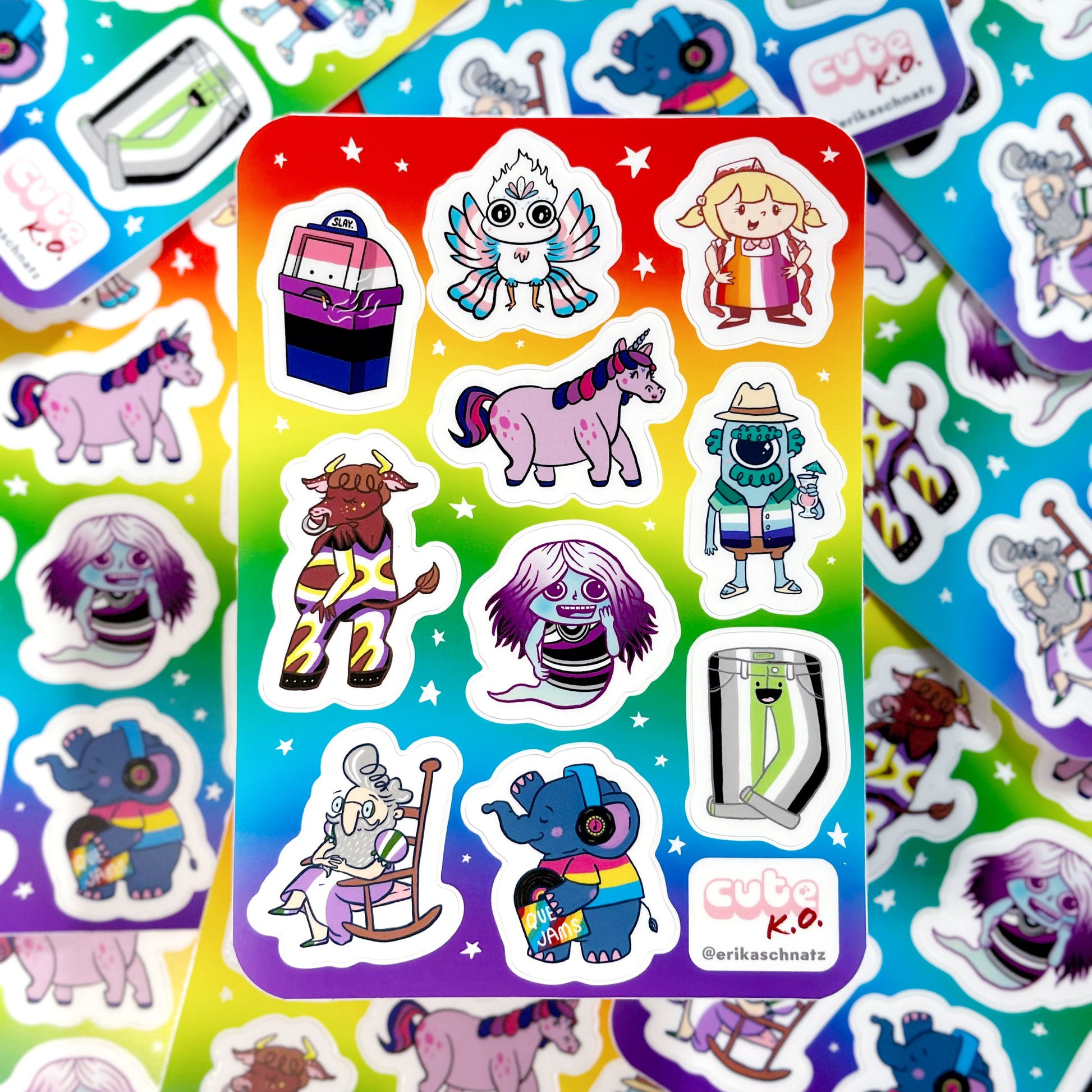 This 5” x 7” sticker sheet features pride variations of 10 Cute K.O. competitors: Trashy Can, Sparkles the Phoenix, Britta Butcher, Fat Unicorn, Blinks the Cyclops, Wee Banshee, Minotodd, Magic Nana, Elephunk, and Pants! These stickers are UV protected for up to three years of outdoor use and are waterproof – perfect for that thermos or water bottle you run through the dishwasher.