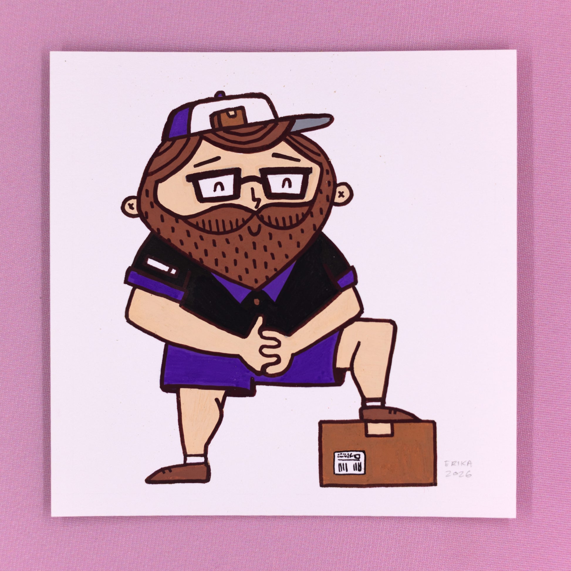 Posca paint pens on vellum bristol board of Cute K.O. 2021 champion Dan Dan the Delivery Man. Measures 5" x 5" unframed, 5.75" x 5.75" framed
