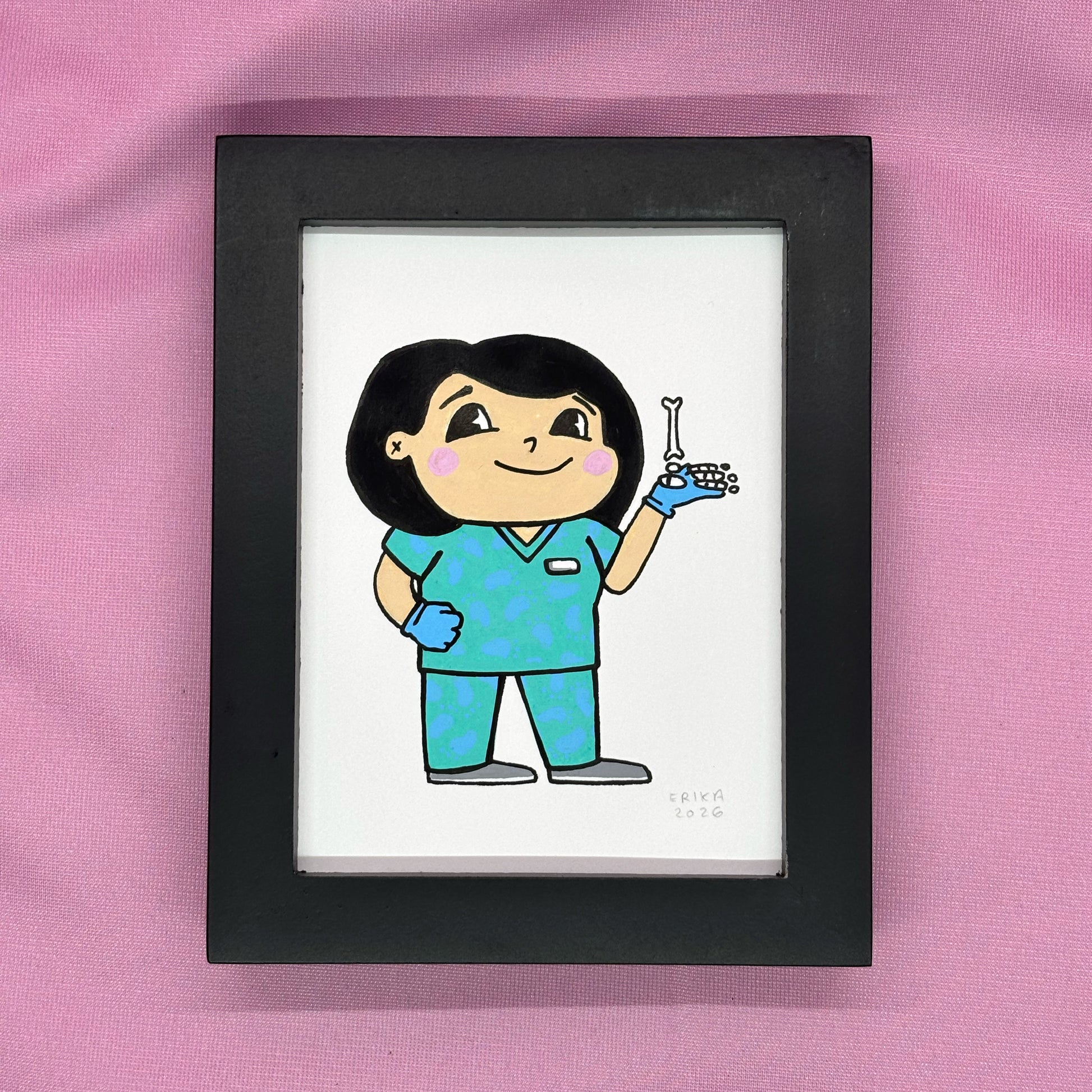 Posca paint pens on vellum bristol board of Cute K.O. 2023 competitor Dr. Ally, Podiatrist. Measures 3" x 4" unframed, 3.75" x 4.75" framed