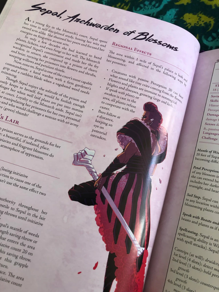 Faerie Fire is a supplemental anthology compatible with Fifth Edition tabletop games, adding new depth and mechanics to the fairy realm. This book features over 50 new original creatures (from CR 1/4 to 19), new player options, and a module (appropriate for levels 2-5). Each page is boldly illustrated with a colorful retro aesthetic, reminiscent of 80s synthwave and 90s school supplies; the book itself is bound in a high-quality hardcover with a vibrant design, a ribbon bookmark, and over 150 full color, gloss pages.