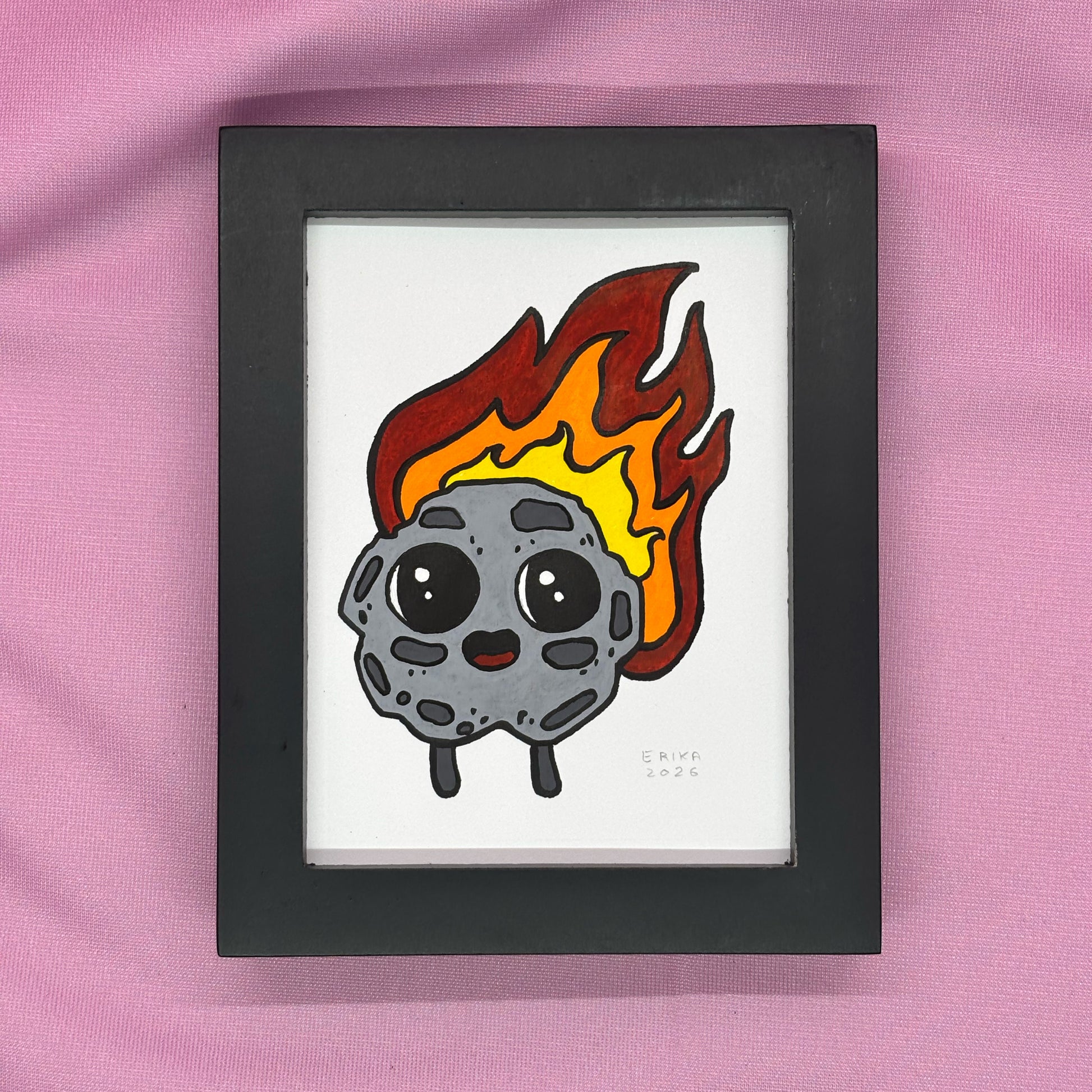 Posca paint pens on vellum bristol board of Cute K.O. 2020 runner-up Flicker the Fireball. Measures 3" x 4" unframed, 3.75" x 4.75" framed