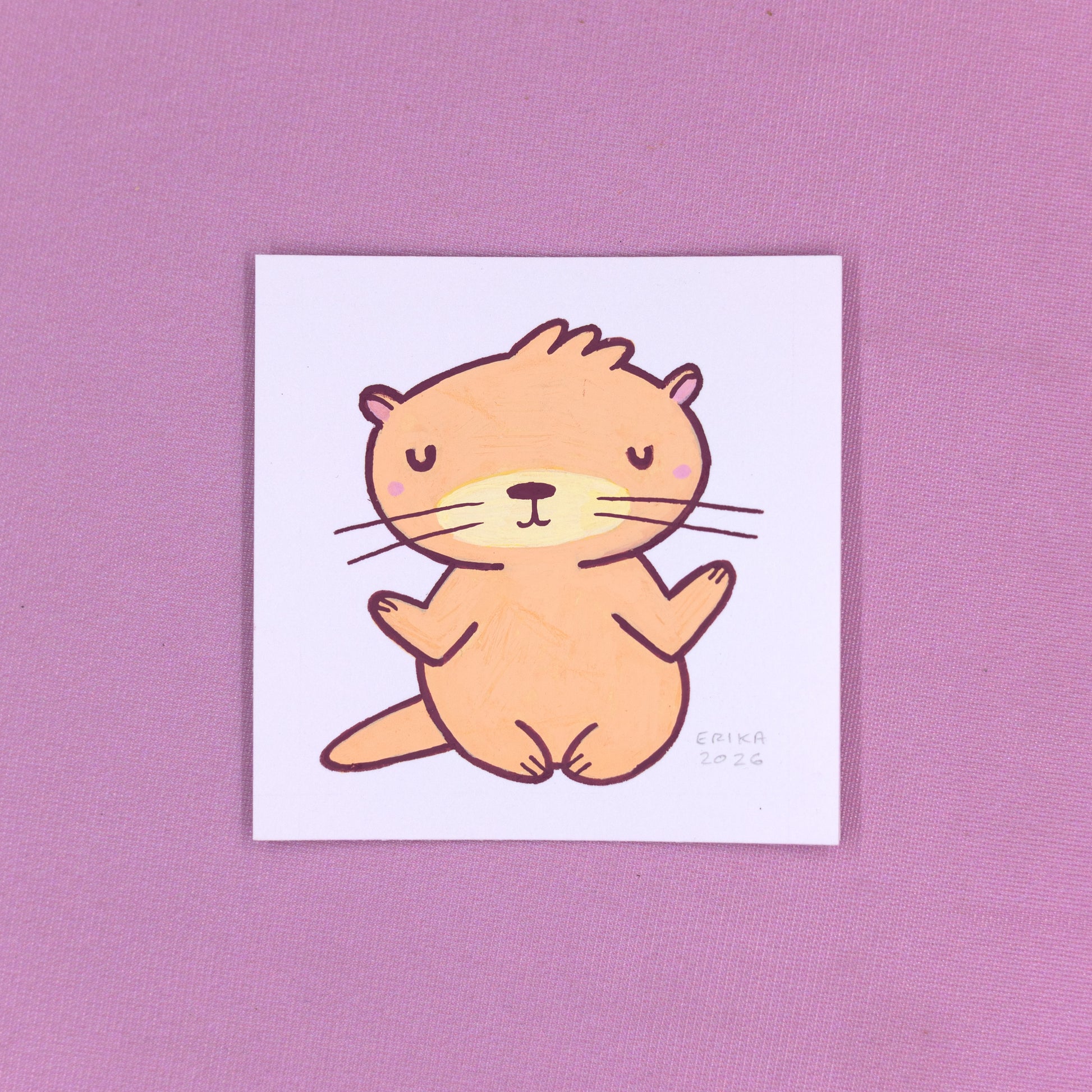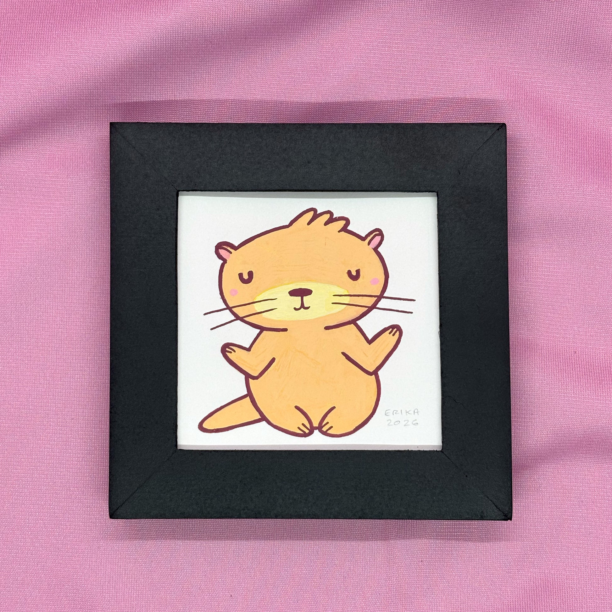 Posca paint pens on vellum bristol board of Cute K.O. 2021 runner-up Floaty Otter. Measures 3" x 3" unframed, 4" x 4" framed