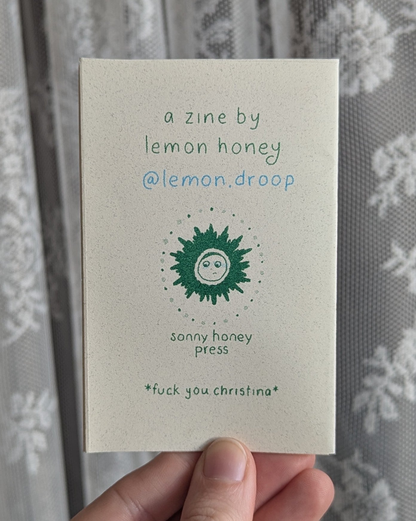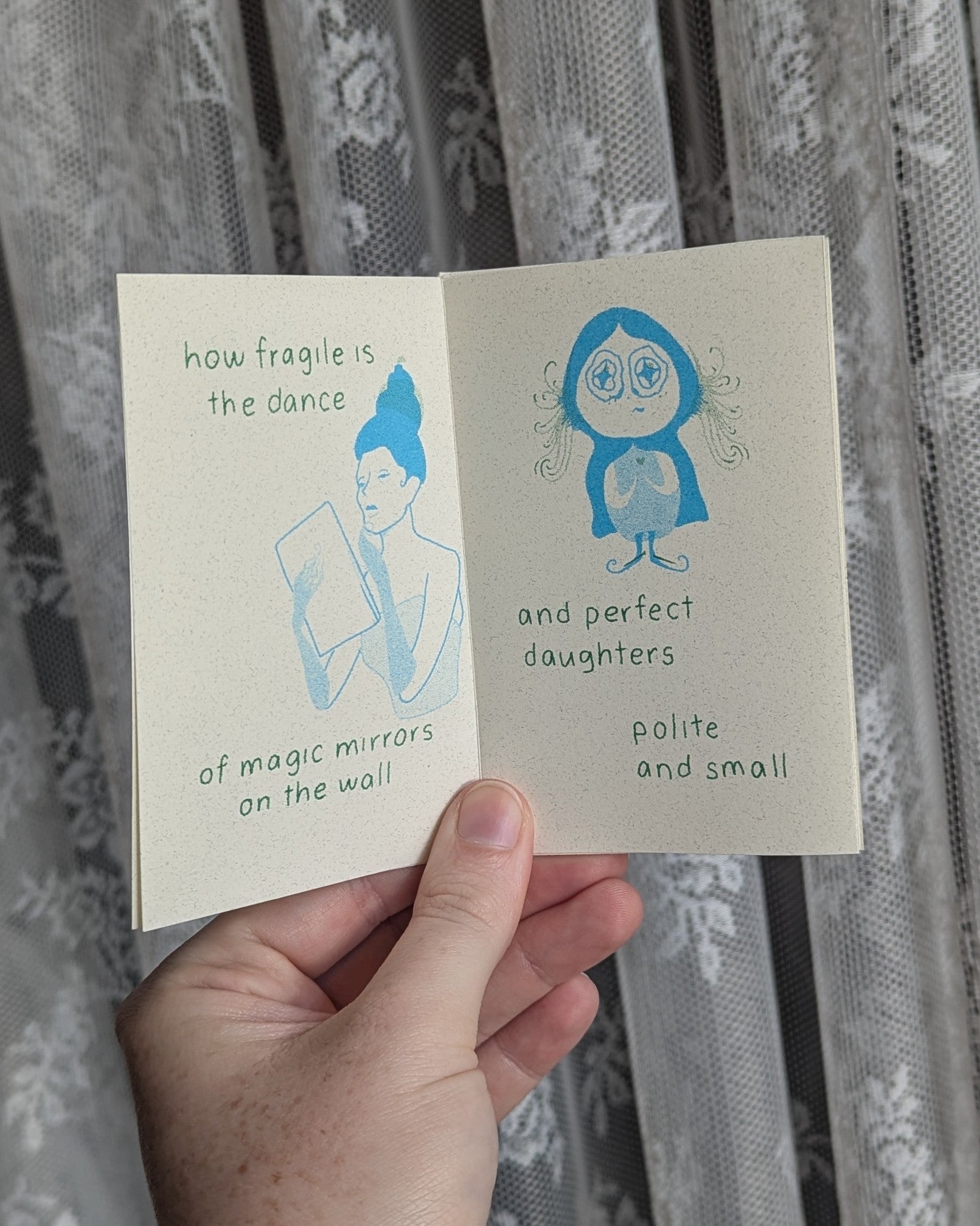 one page zine printed in grass and aqua with text that reads "forget me not for i forgot, how fragile is the dance, of magic mirrors on the wall, and perfect daughters polite and small, forget me not for i forgot, how vile i must be, your precious daughter turned to son, whose voice at last is free, forget me not for i forgot you have never known me"