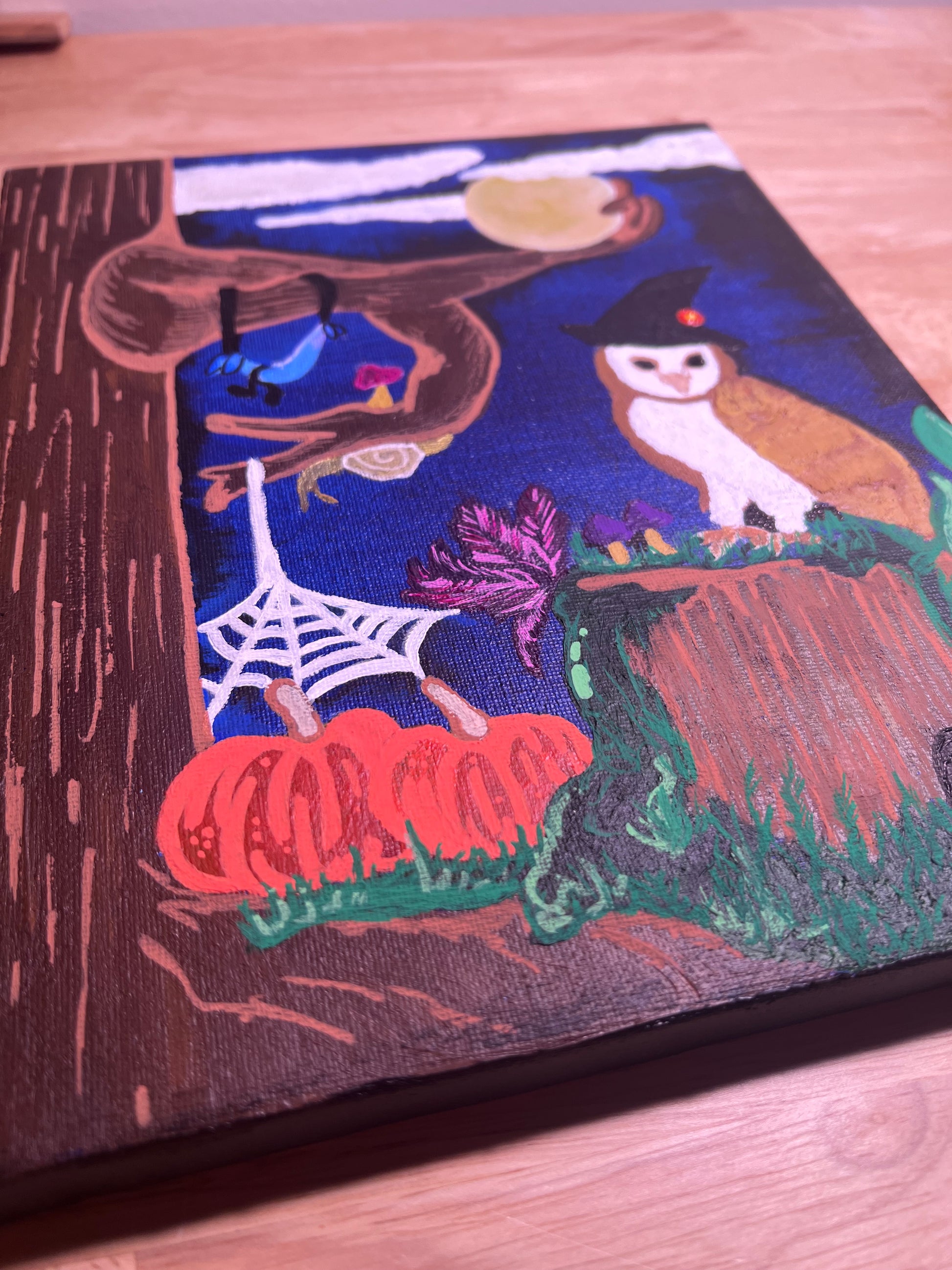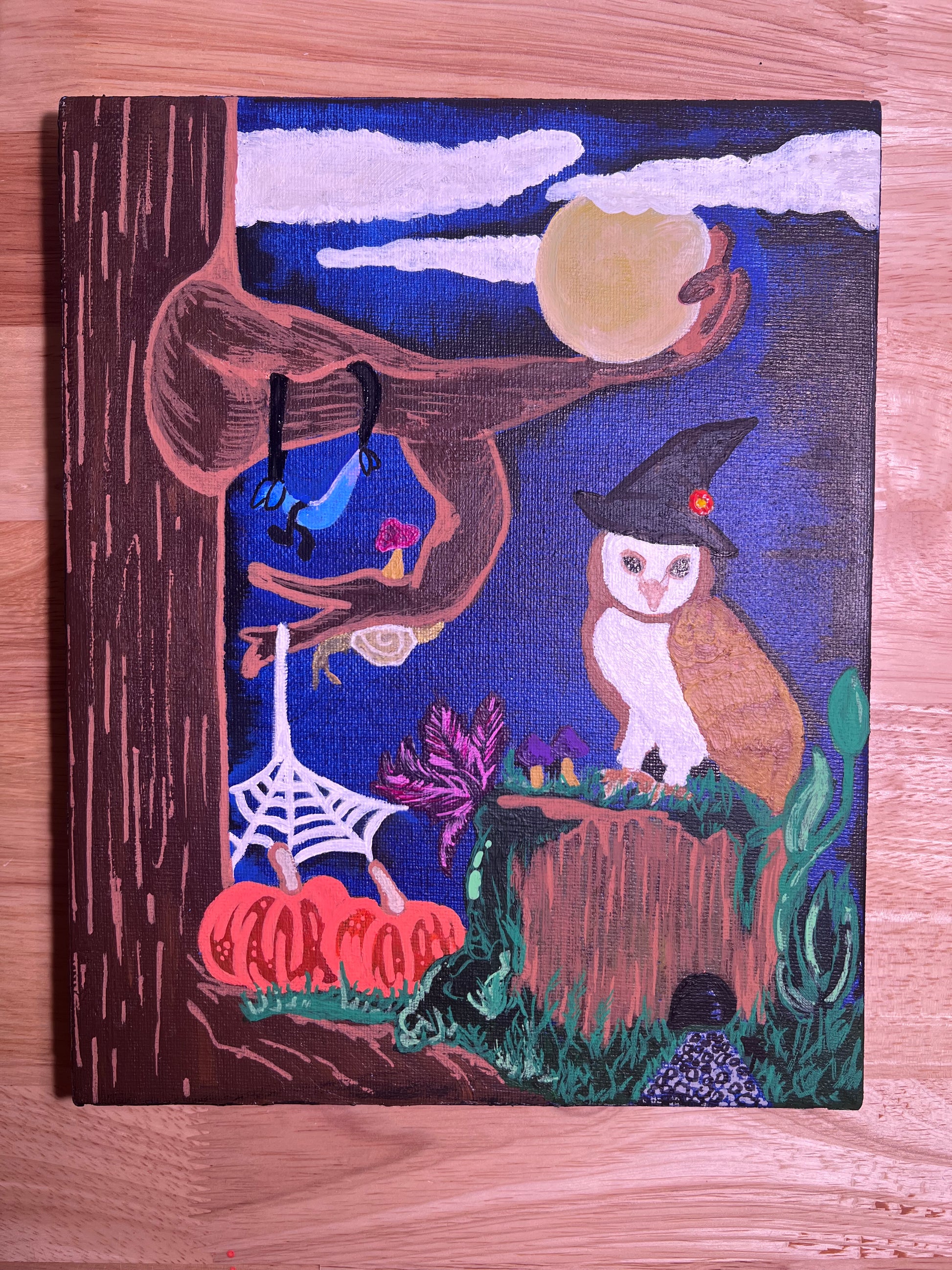 Inspired by the wisdom of nature, the mystical owl is seen sitting below the light of the full moon, emanating a glow onto a brightly colored forest and its nocturnal inhabitants. She’s just returned to her trunk portal, as she takes a moment to reflect on her long travels—where there are no bounds to the shapes she shifts into. This piece was done with acrylic paints and markers on canvas.