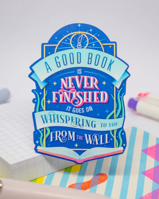 "A good book is never finished. It goes on whispering to you from the wall." 2.5" x 3.25" sticker. Printed on premium vinyl with matte finish.