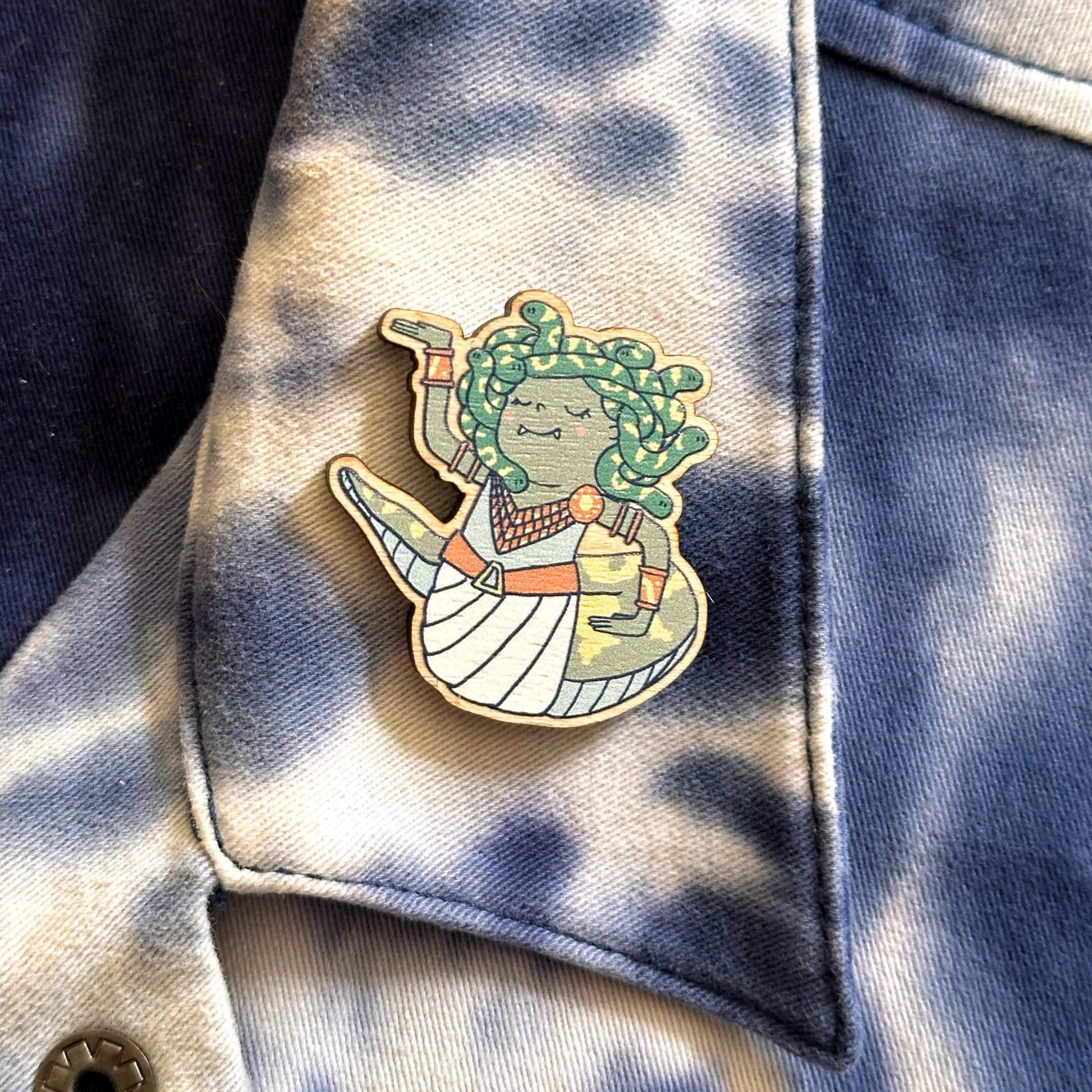 It’s 2019 Cute K.O. champion Gracey the Gorgon! This 1.5” full-color custom-printed wooden pin is made from responsibly sourced, fast-growing maple veneered MDF. It’s .125” thick and has a white star-shaped rubber backer for extra cuteness. Backed by a star-covered card on pink cardstock with Gracey facts on the card back!