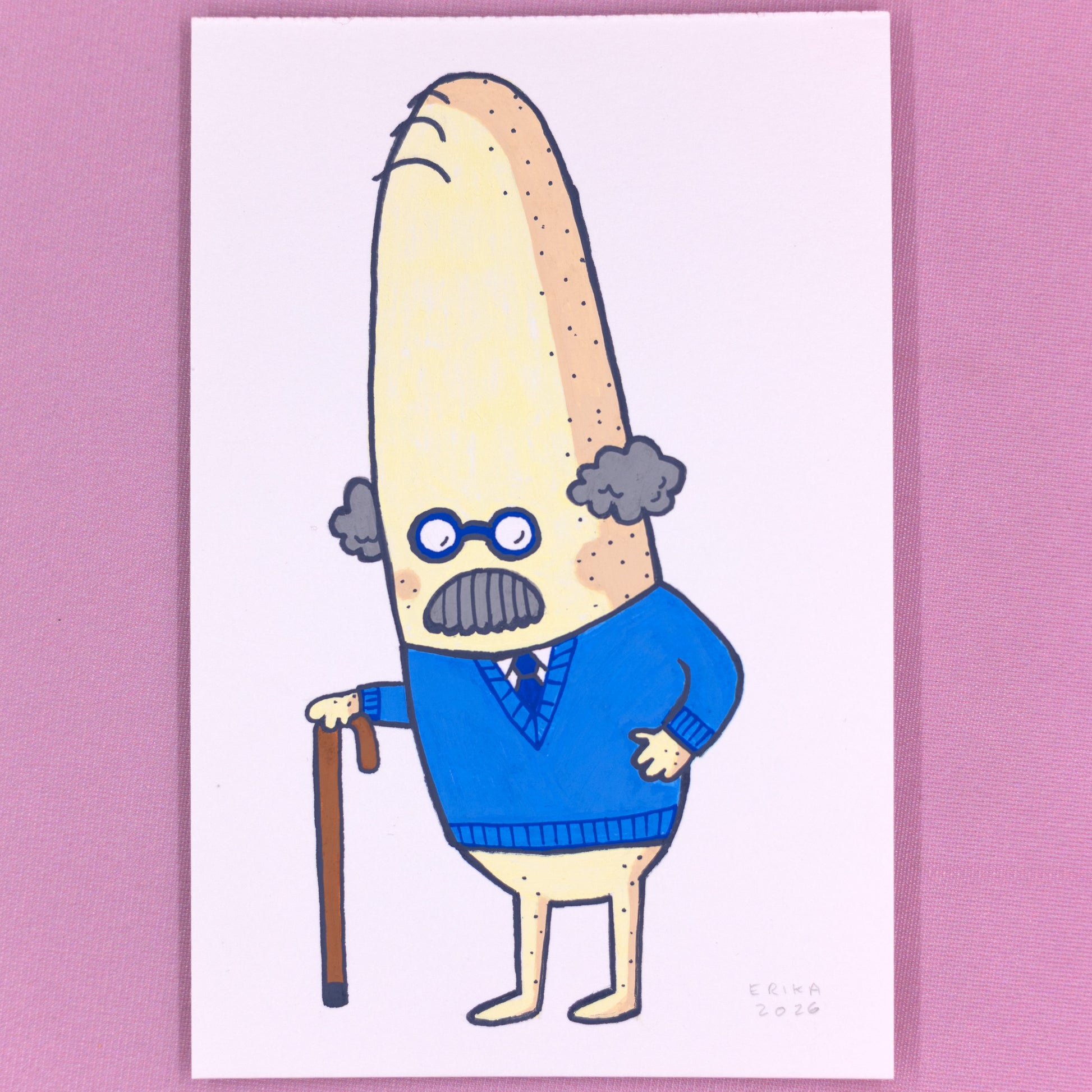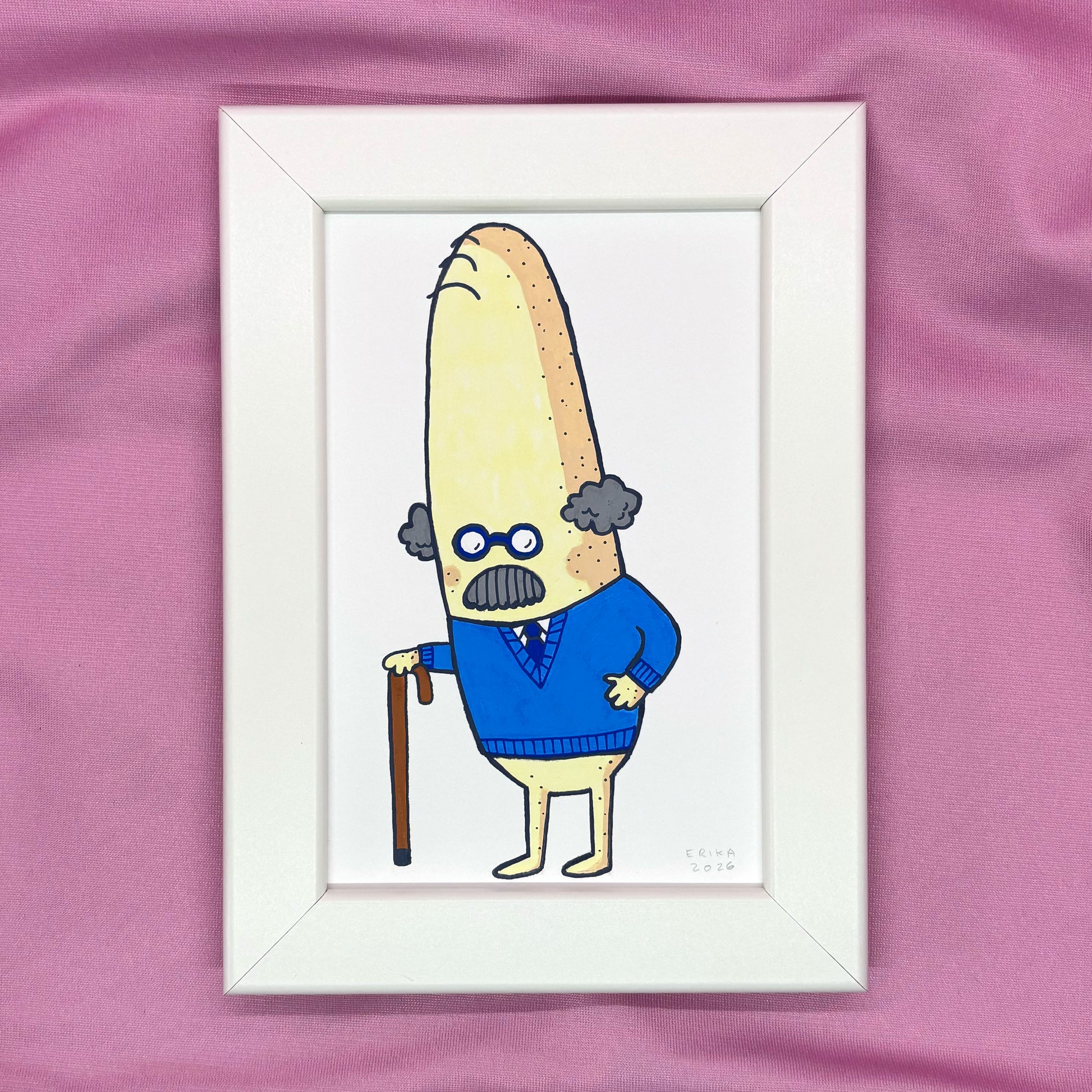 Posca paint pens on vellum bristol board of Cute K.O. 2017 runner-up Grandpa Breadstick. Measures 4" x 6" unframed, 5.25" x 7.25" framed
