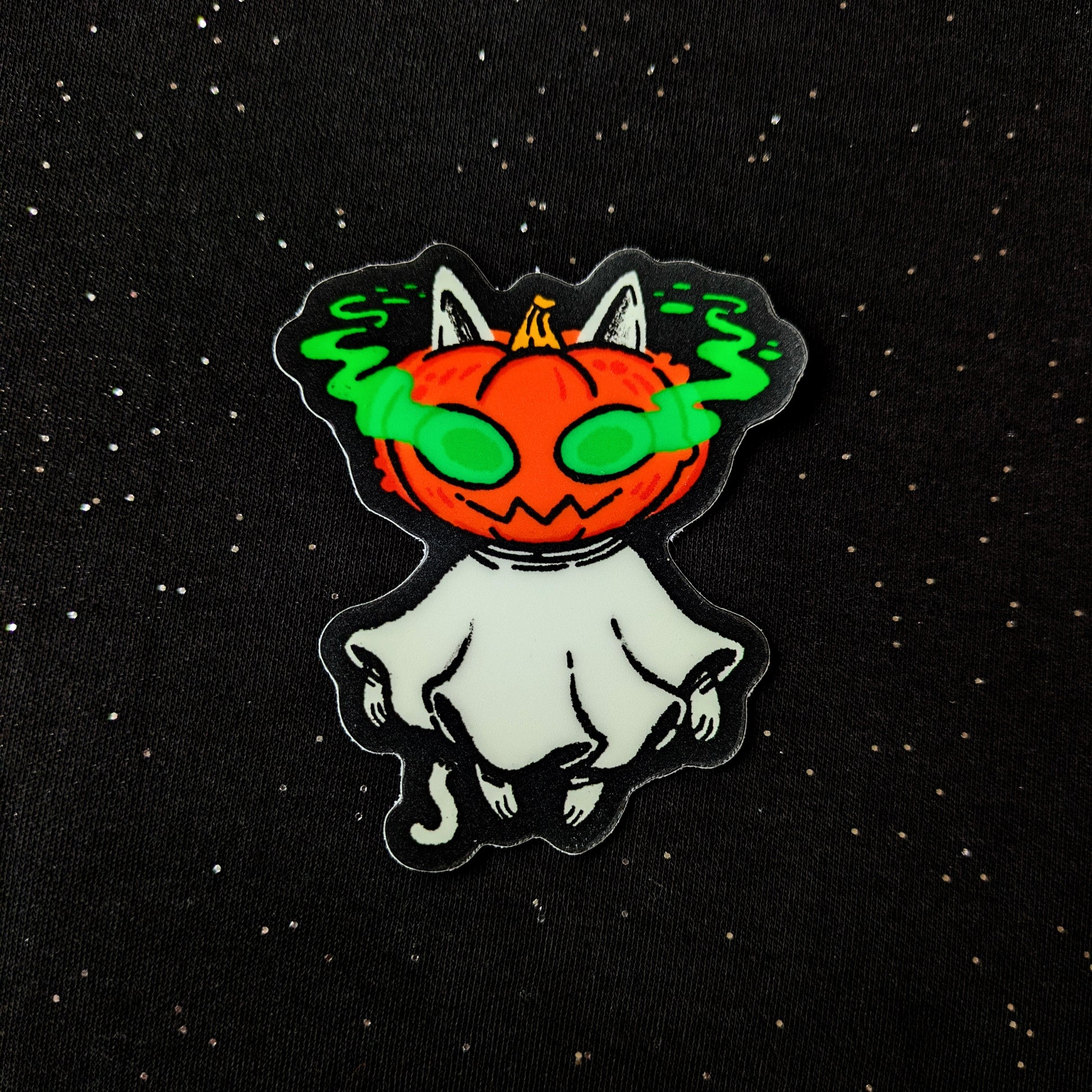 3 inches tall, 2.5 inches wide. Glossy sticker of a a kitty Spirit of Halloween - the glowing green eyes are holographic!
