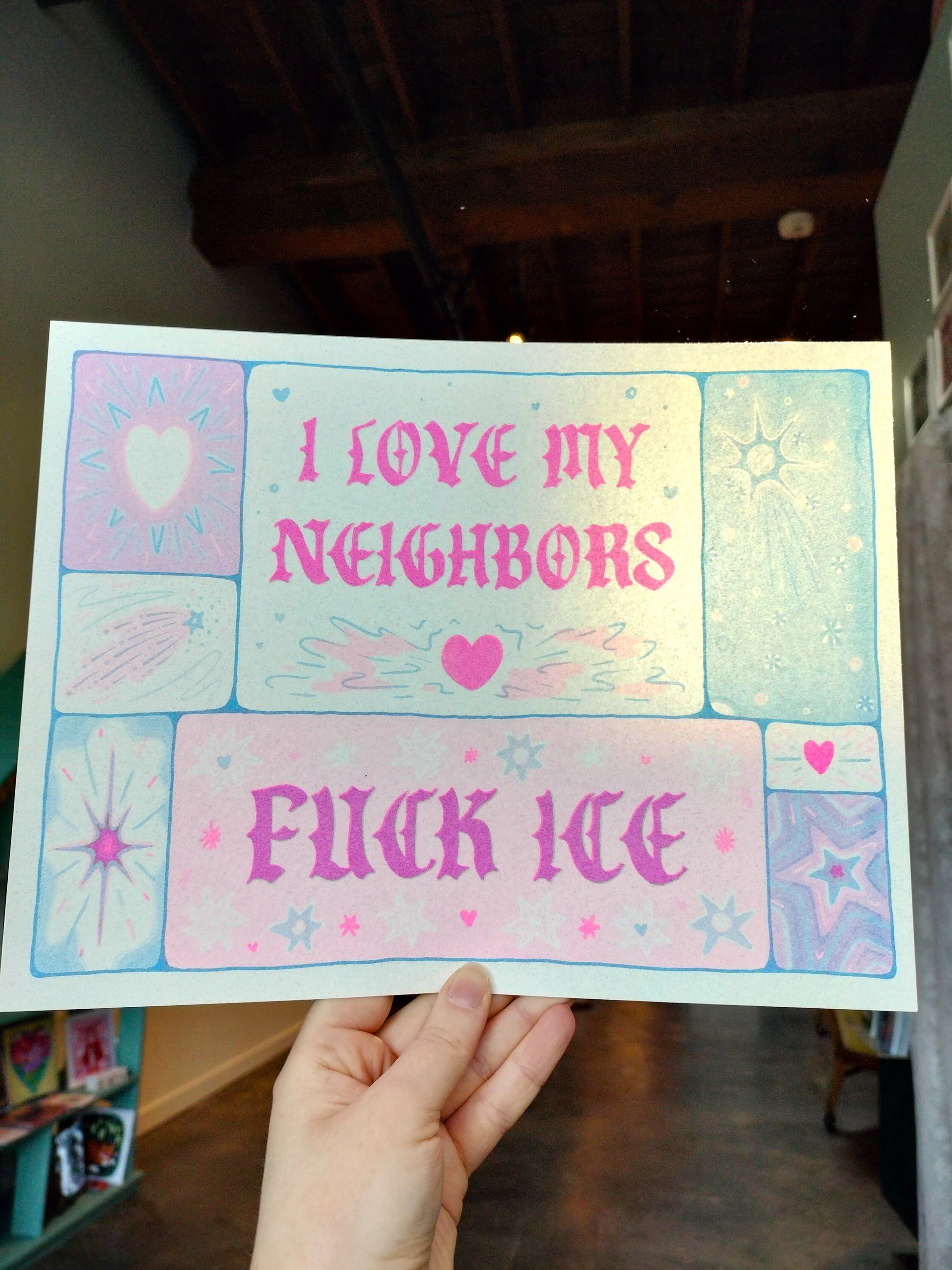 2 color riso print in blue and pink with text that reads "I LOVE MY NEIGHBORS F*CK ICE"