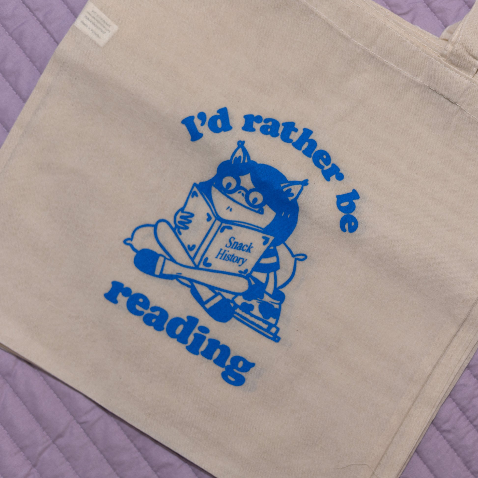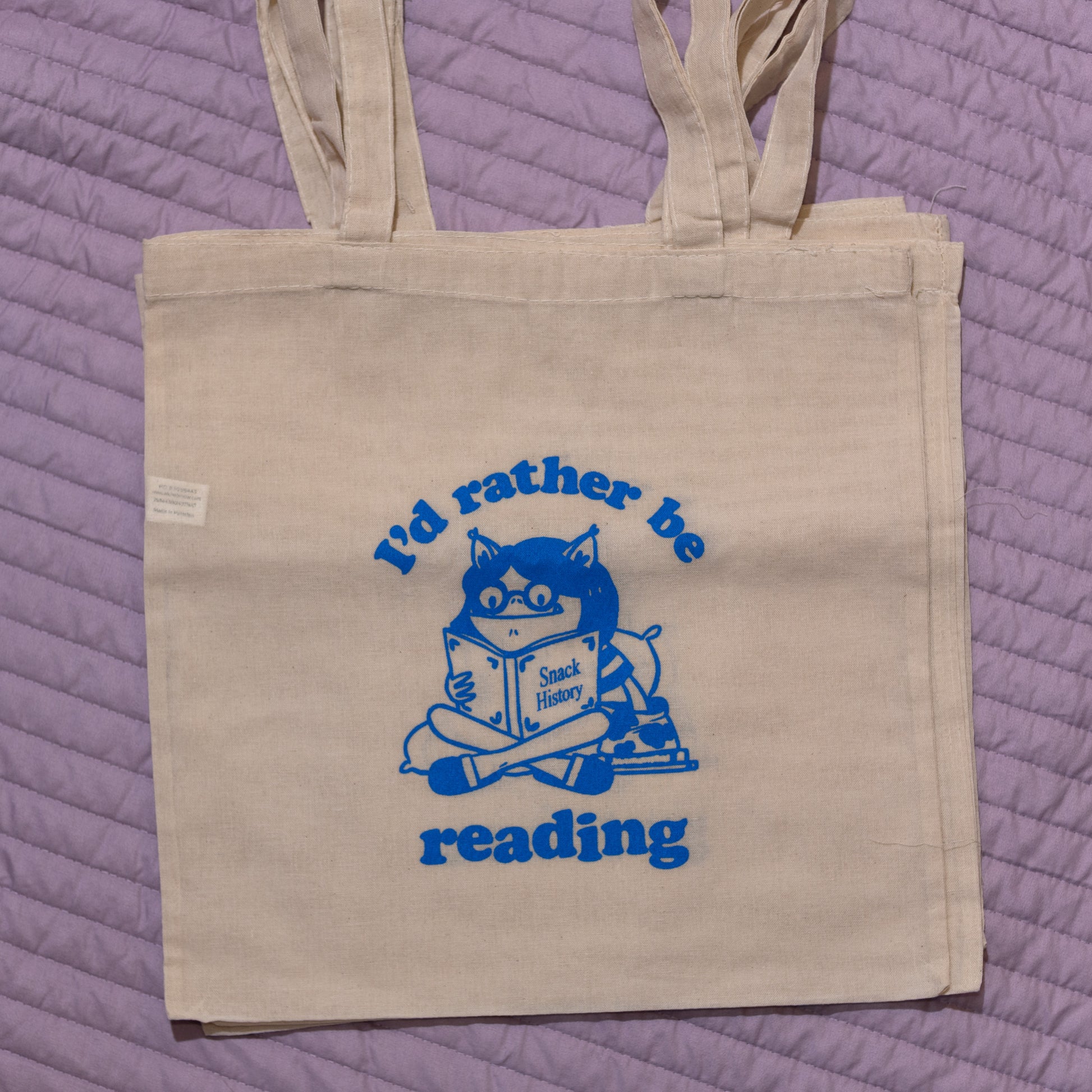 This handy tote is made of 4oz cotton with reinforced 30" handles to provide an easy over-the-shoulder carry. This durable tote is lightweight and at 15 x 15", it can hold quite a few books and/or snacks! Features blue lineart of Snack Gremlin reading a book titled "Snack History" surrounded by the text "I'd rather be reading."