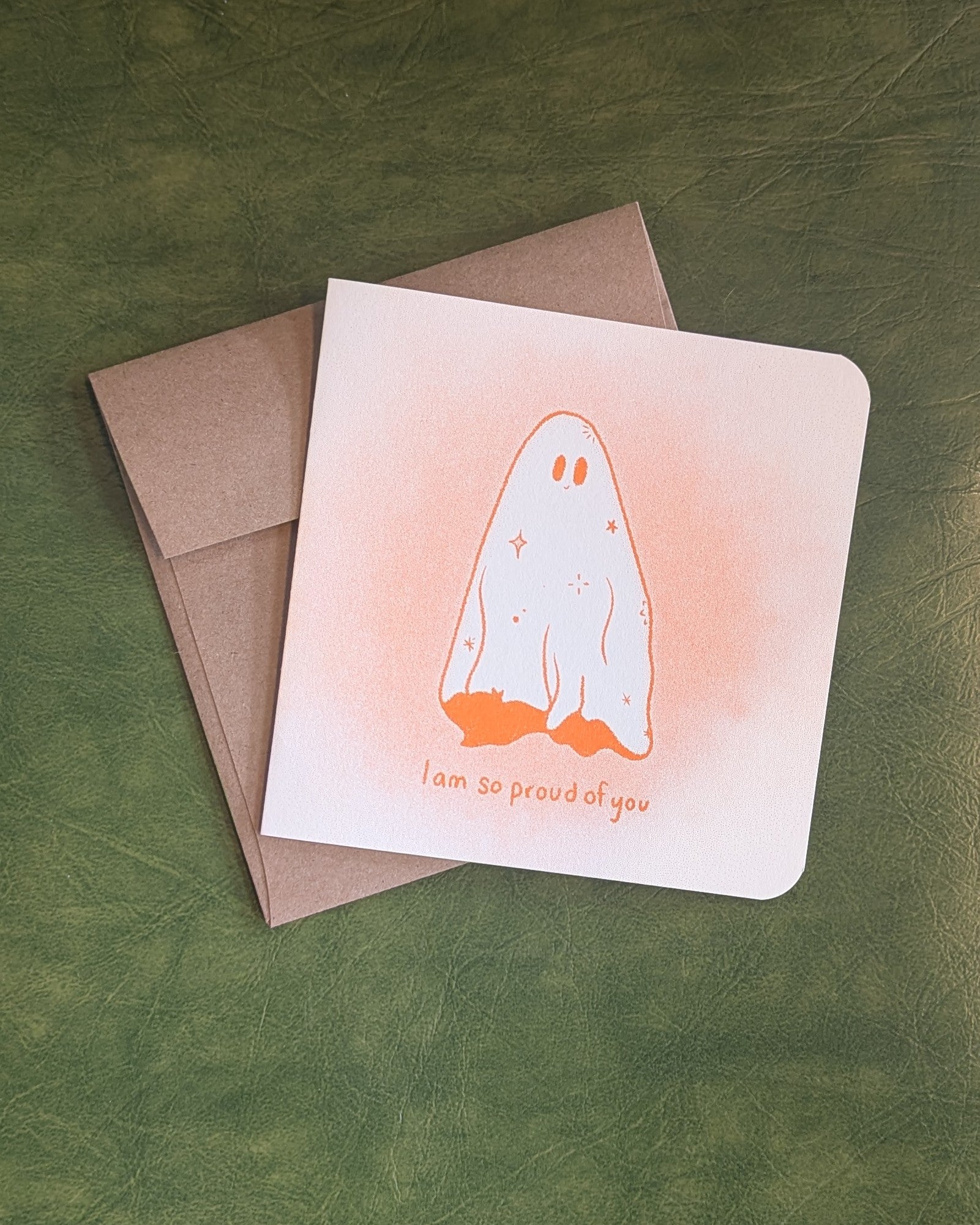 5in by 5in risograph greeting card printed in blue or orange depicting a magical starry glowy ghost with the text "i am so proud of you" the inside of the card is blank and the back of the card has small a simple sonny honey press logo arrives packaged in a clear sleeve with a brown envelope for protection and convenience designed by lemon.droop and printed locally at outlet pdx