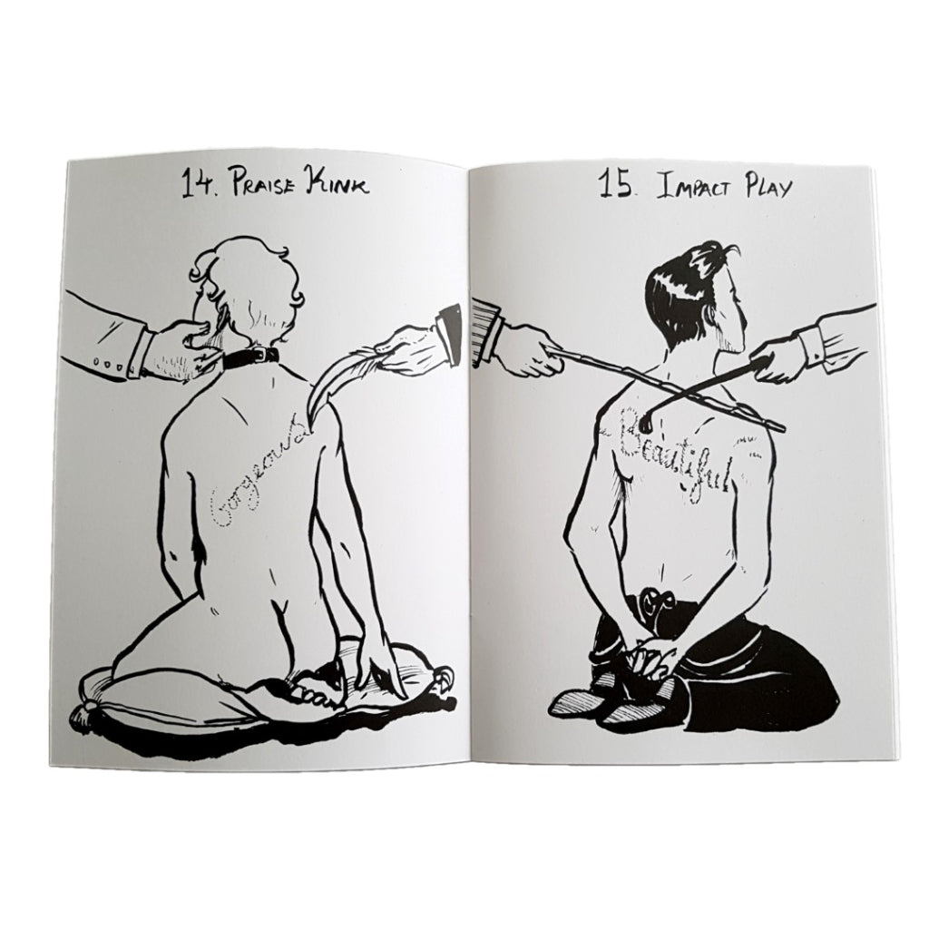 1 Collaring 2 Bondage 3 Deepthroat 4 Begging 5 Rimming 6 Sensory Deprivation 7 Spanking 8 Orgasm Denial 9 Edge Play 10 Spit Roasting 11 Master & Slave 12 Hair Pulling 13 Biting 14 Praise Kink 15 Impact Play 16 Threesomes & Moresomes 17 Overstimulation 18 In Public 19 Scars 20 Double Penetration 21 Dominance & Submission 22 Frottage 23 Gags 24 Boot Worship 25 Asphyxiation 26 Fisting 27 Aphrodisiacs 28 Sadomasochism 29 Punishment 30 Suspension 31 Aftercare & Afterword