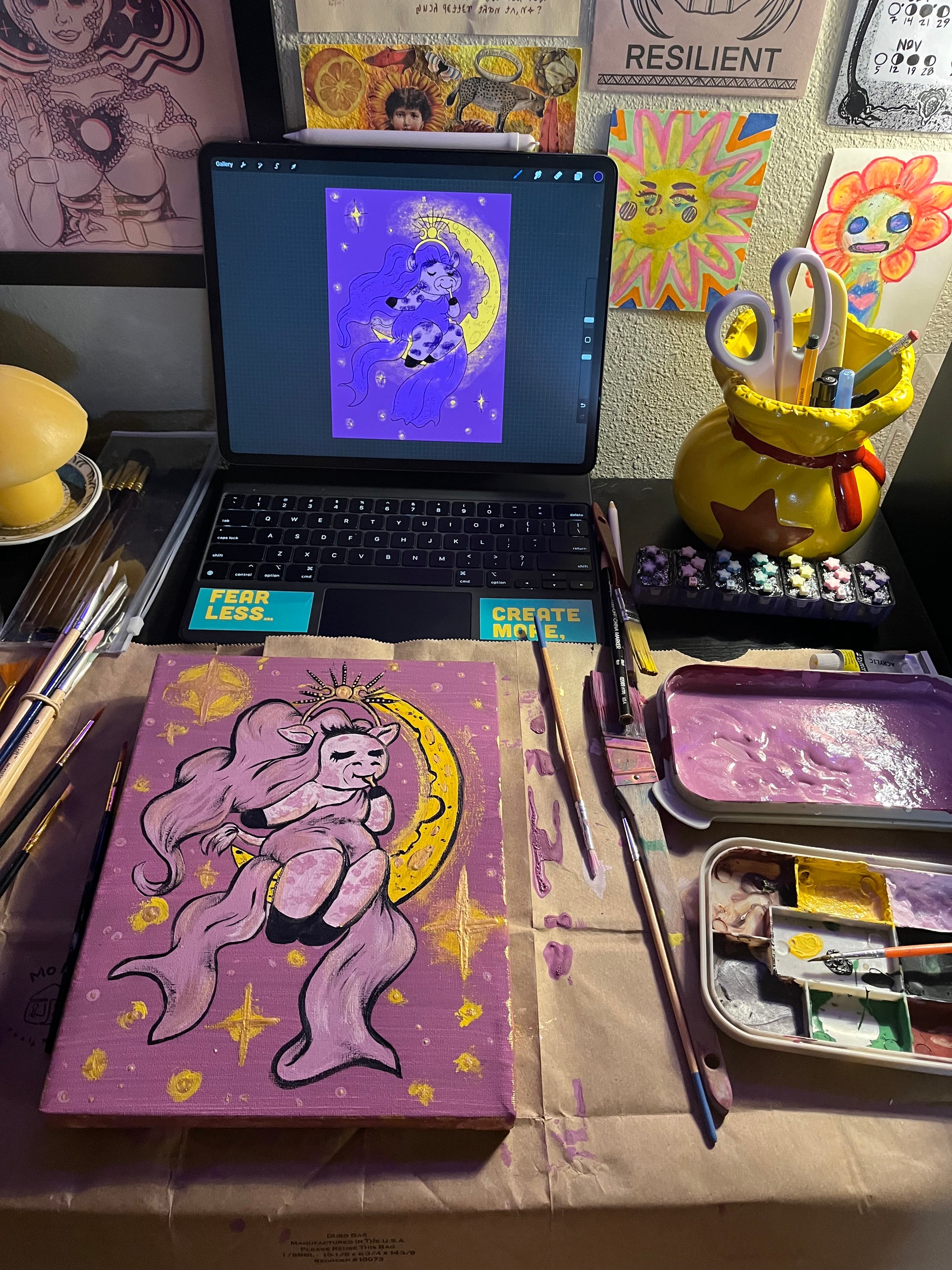When the cow jumped over the moon, they decided to stay there. No longer would the cow be forced to endure the little dogs barking laughter; the sparkling solitary glow of the moon promised peace and reflection. The cow discovered the moon was made of a celestial cheese that granted the cow magical powers when consumed, transforming our ordinary bovine into La Quesa Celestia, the Gouda Goddess! Bask in the warm gooey glow of their cheesy glory and know that wherever you adventure, the stars are shining their light on your crown.