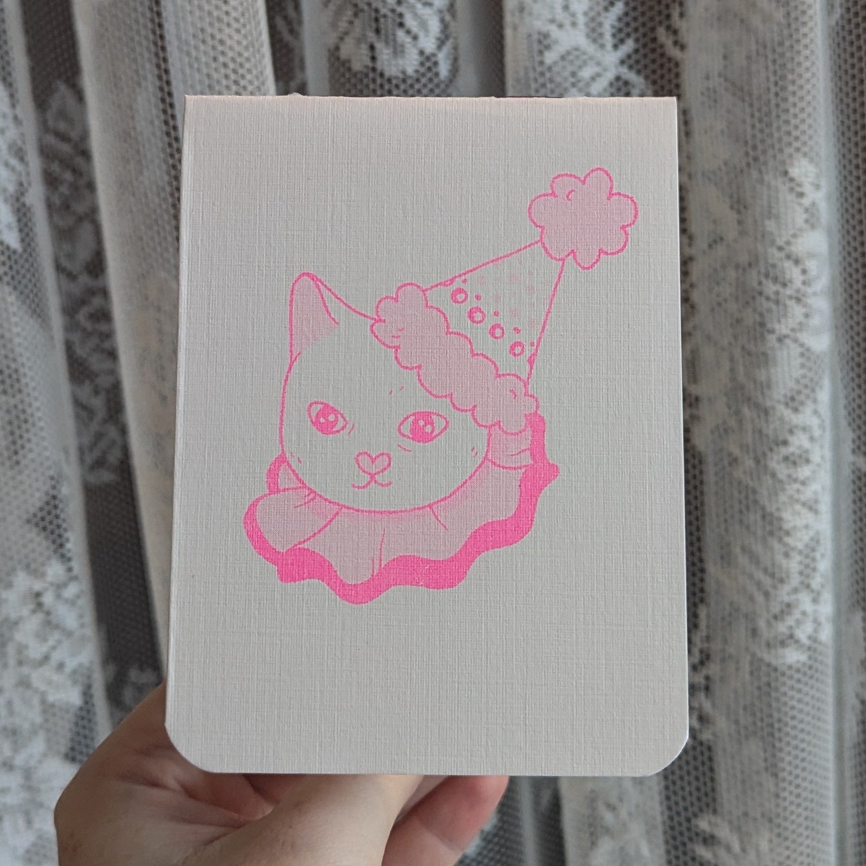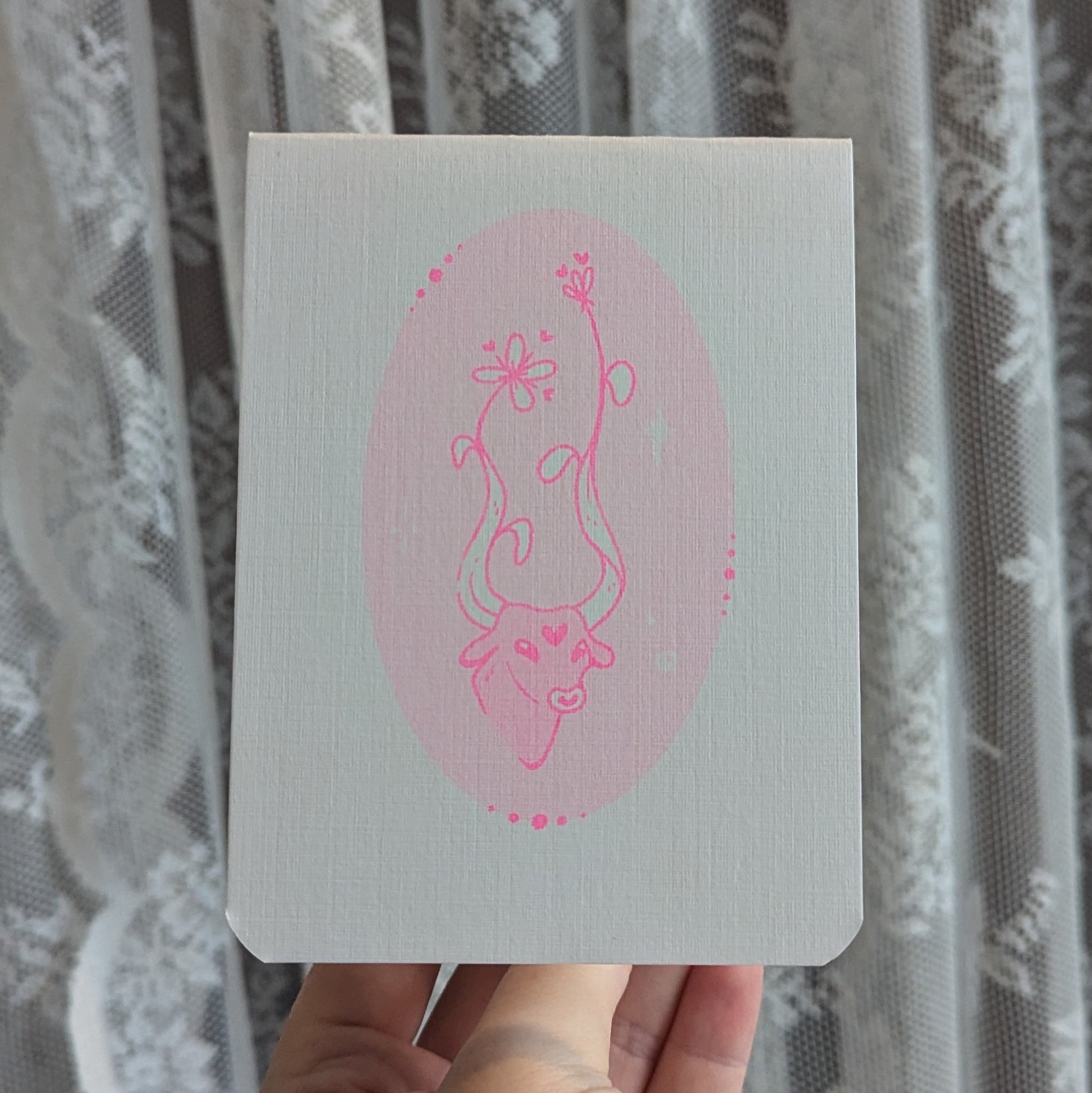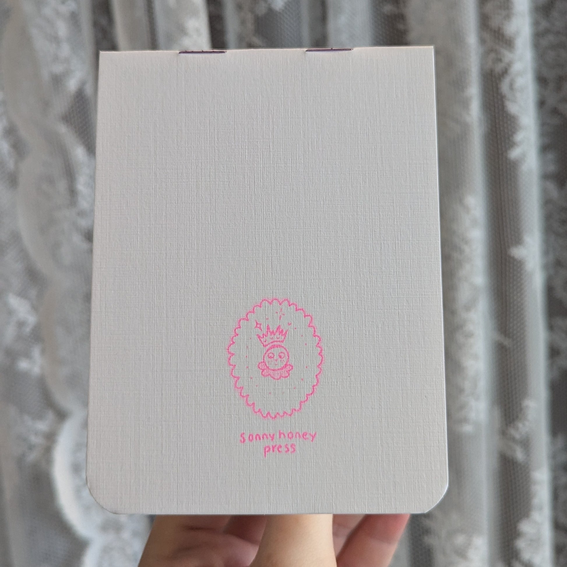 3.5 by 4.75in hand bound risograph printed notebooks with 8 internal pages