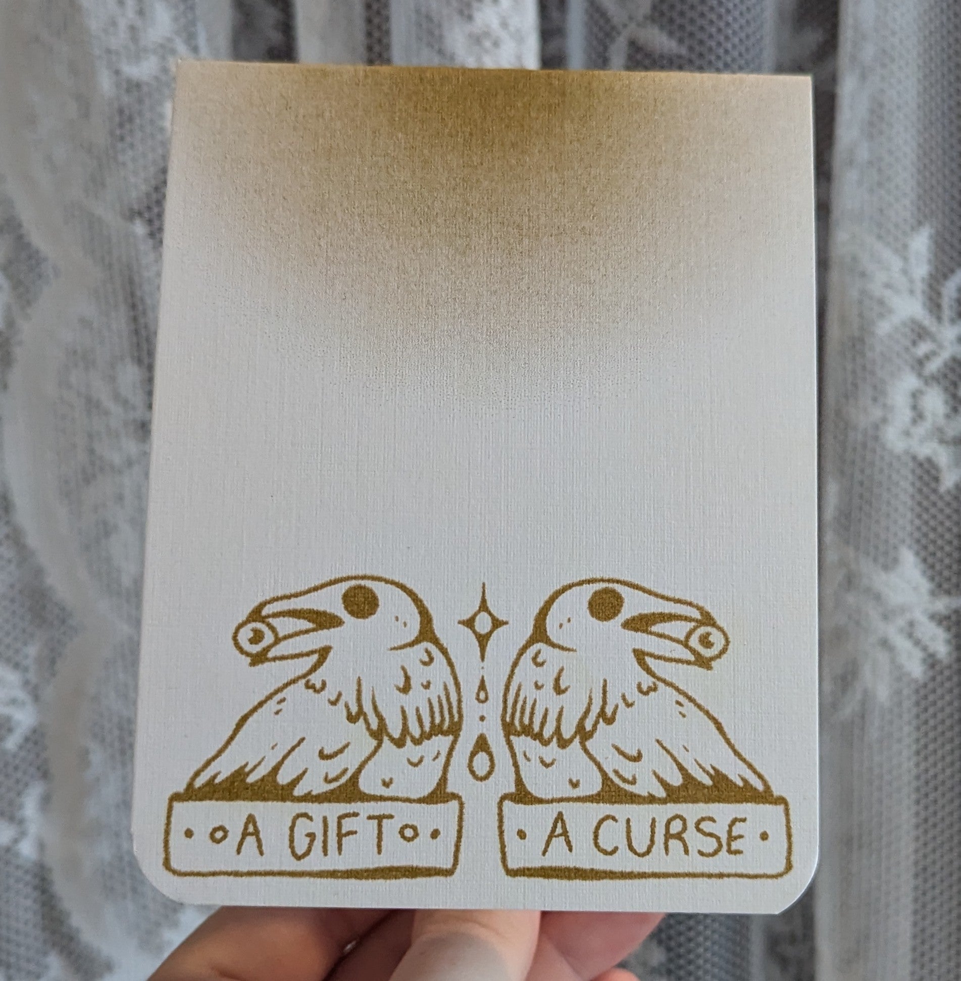 the gold set includes 2 notebooks, one featuring a night landscape and the other journal showcasing 2 crows with the text "a gift, a curse"