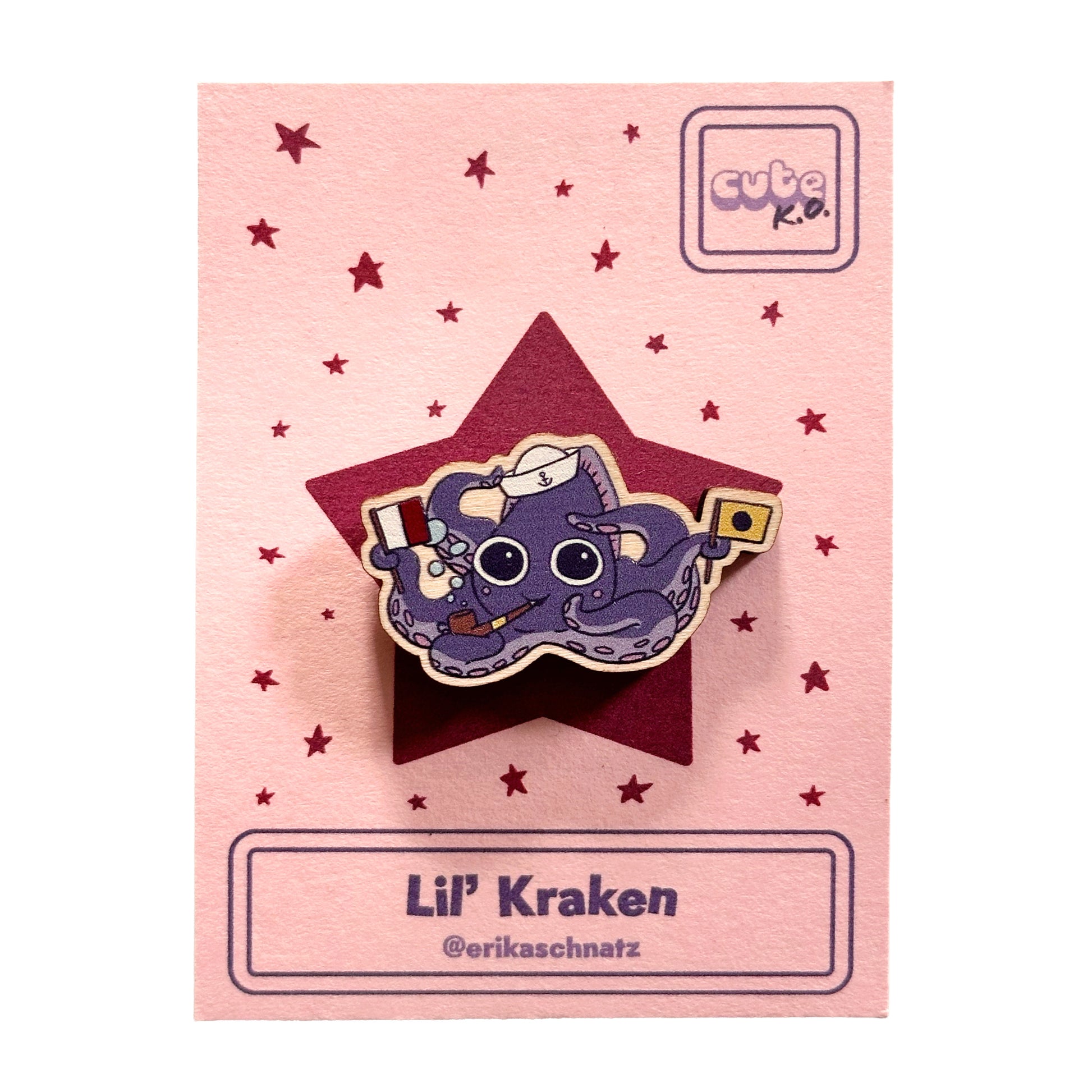 Holy tentacles, it’s Cute K.O. 2017’s Lil’ Kraken! This 1.25” full-color custom-printed wooden pin is made from responsibly sourced, fast-growing maple veneered MDF. It’s .125” thick and has a white star-shaped rubber backer for extra cuteness. Backed by a star-covered card on pink cardstock with Lil’ Kraken facts on the card back! Nautical!