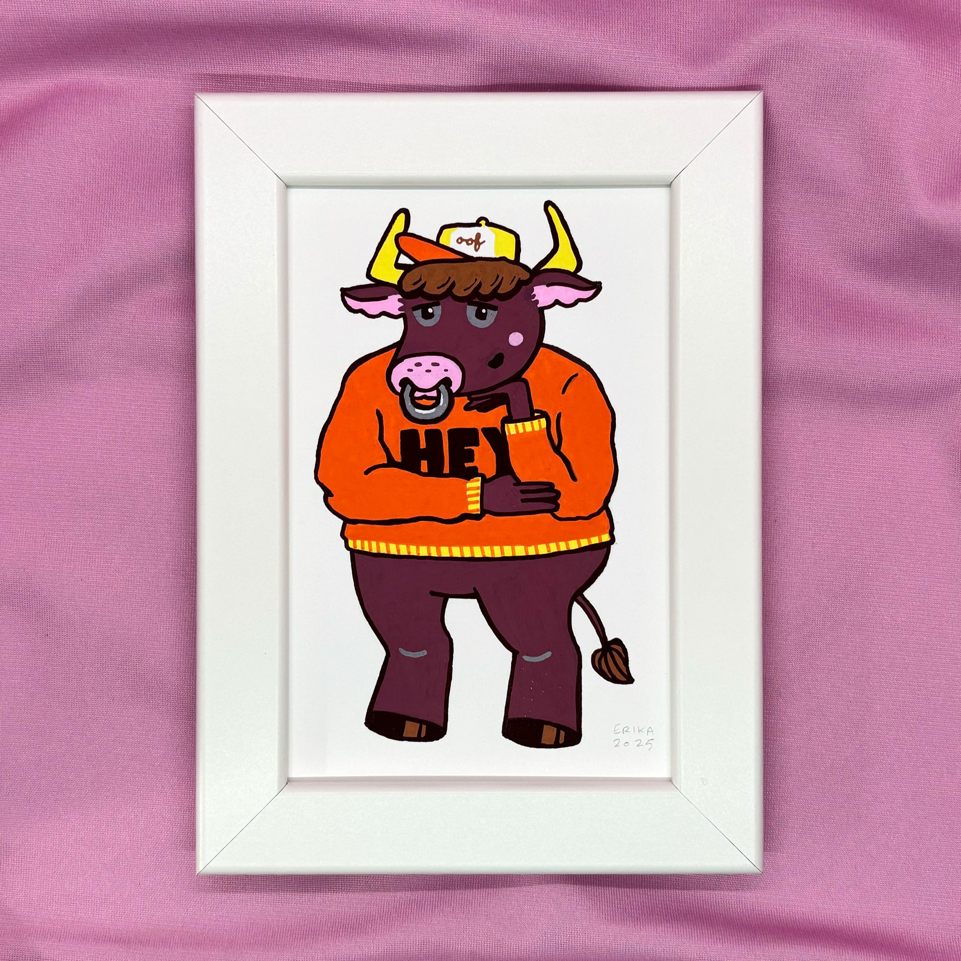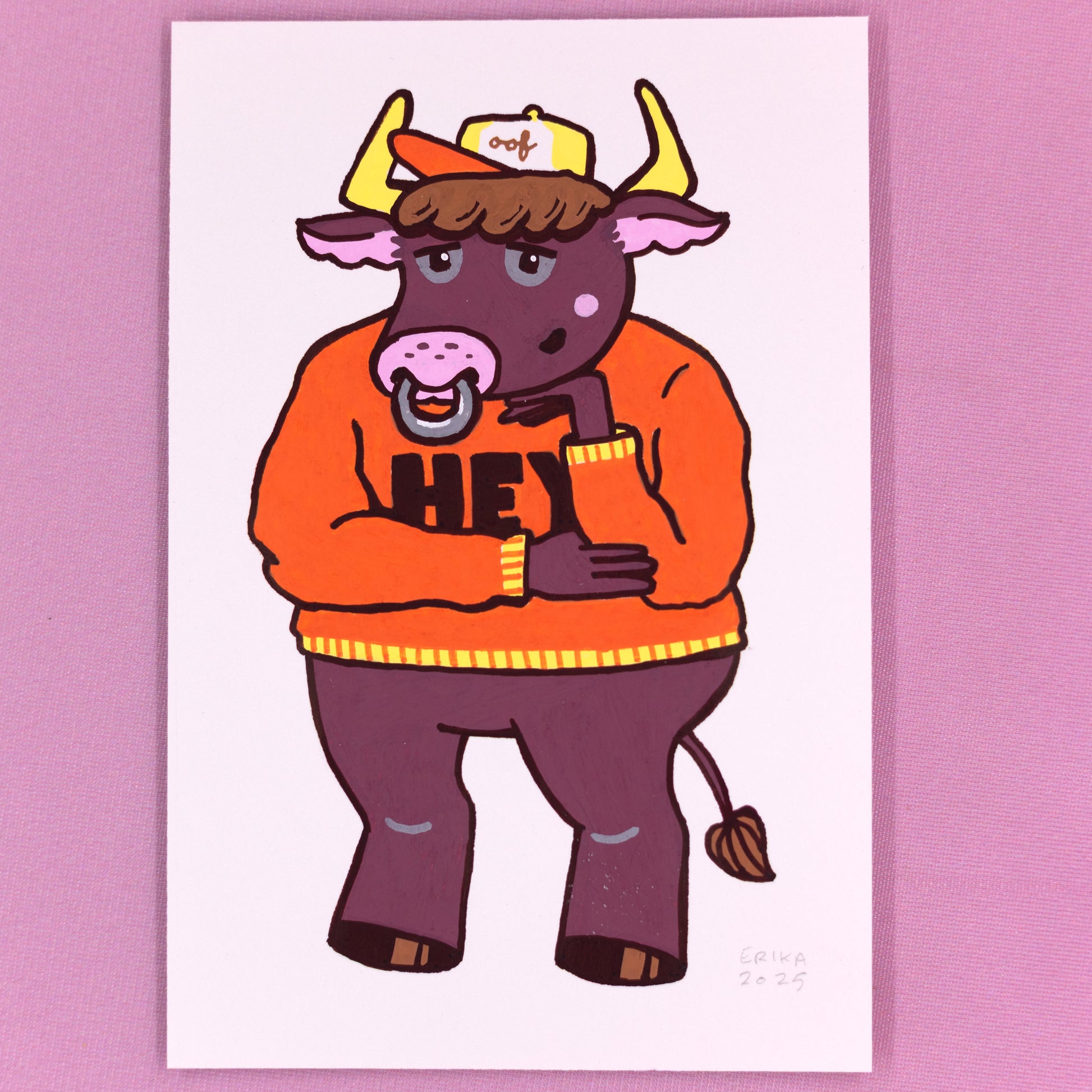 Posca paint pens on vellum bristol board of Cute K.O. 2022 runner-up Minotodd. Measures 4" x 6" unframed, 5.25" x 7.25" framed