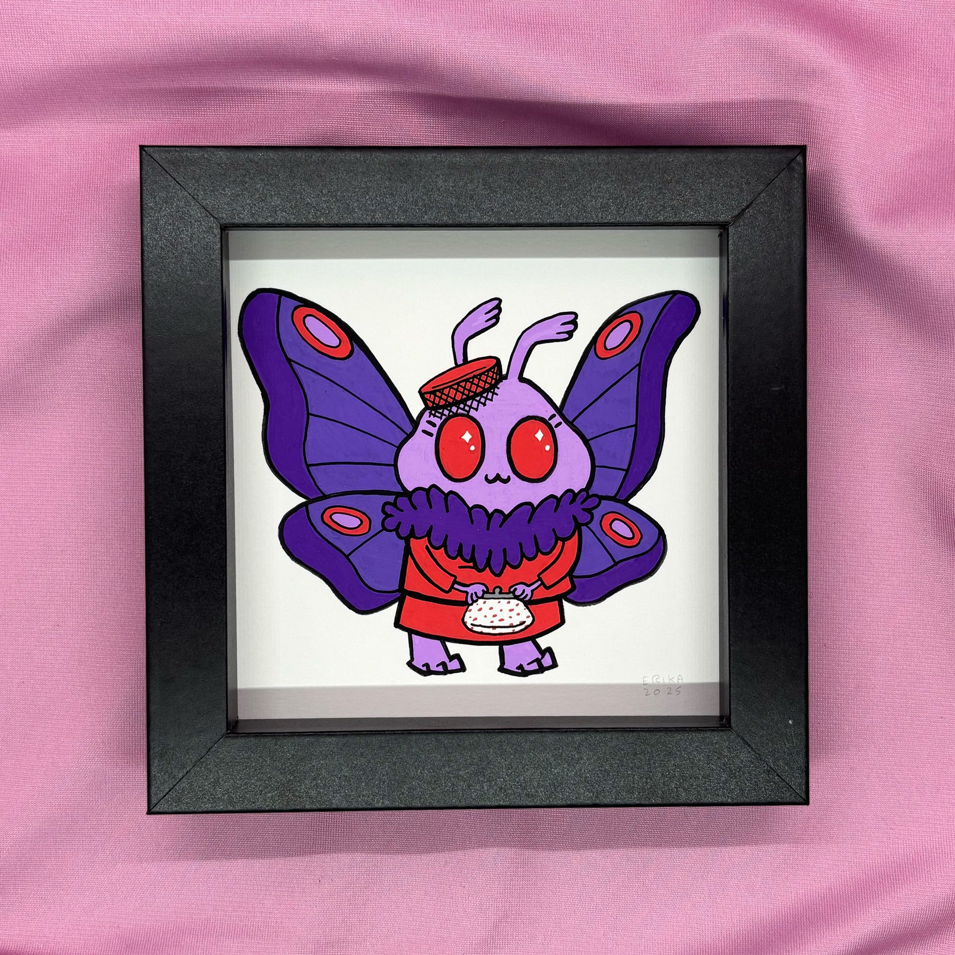 Posca paint pens on vellum bristol board of Cute K.O. 2024 competitor Ms. Moth. Measures 5" x 5" unframed, 5.75" x 5.75" framed