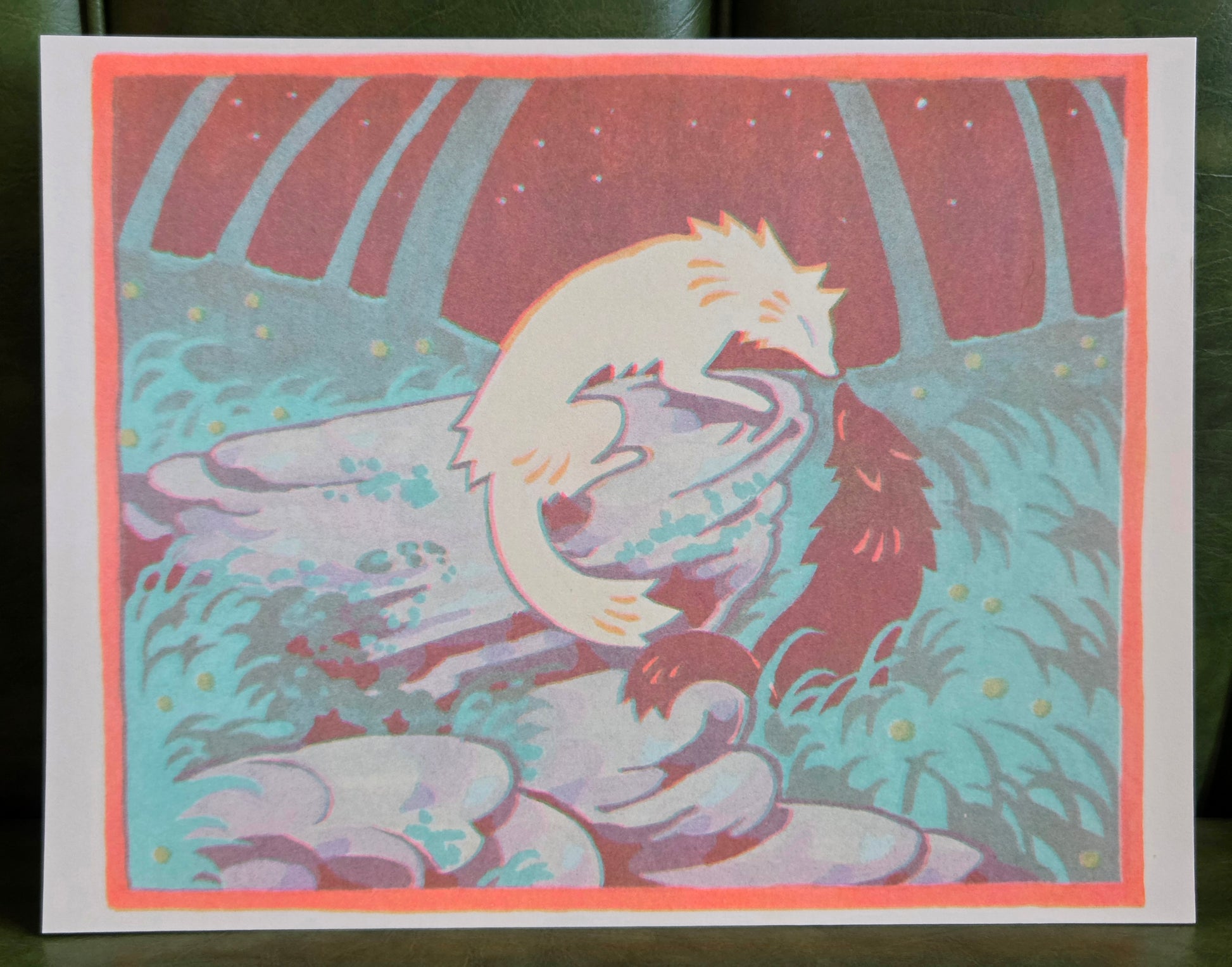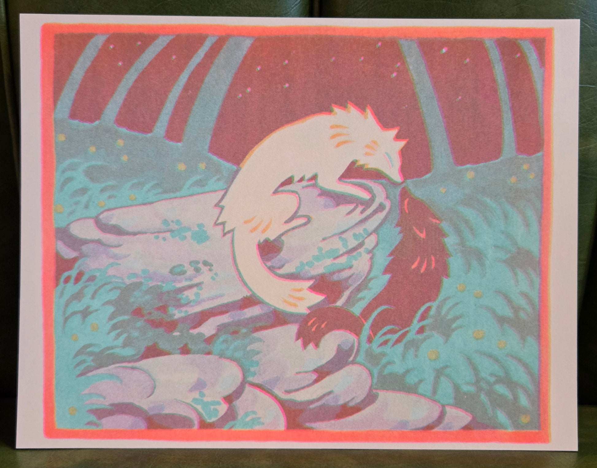 8.5" x 11" three color risograph print depicting two wolves touching noses