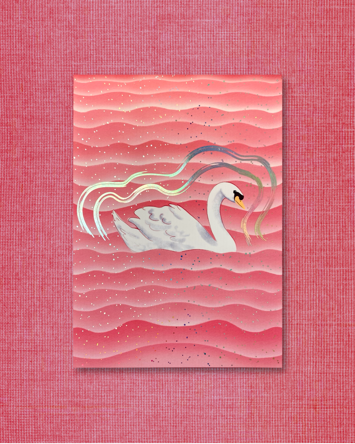 These are created with a three step printmaking process, which involves printing the colored design with an inkjet printer, printing foil accent areas on top with a laser printer and applying the foil to the laser printed areas with lamination.