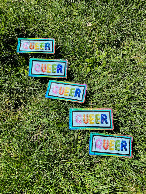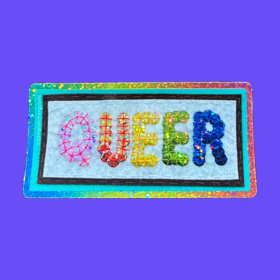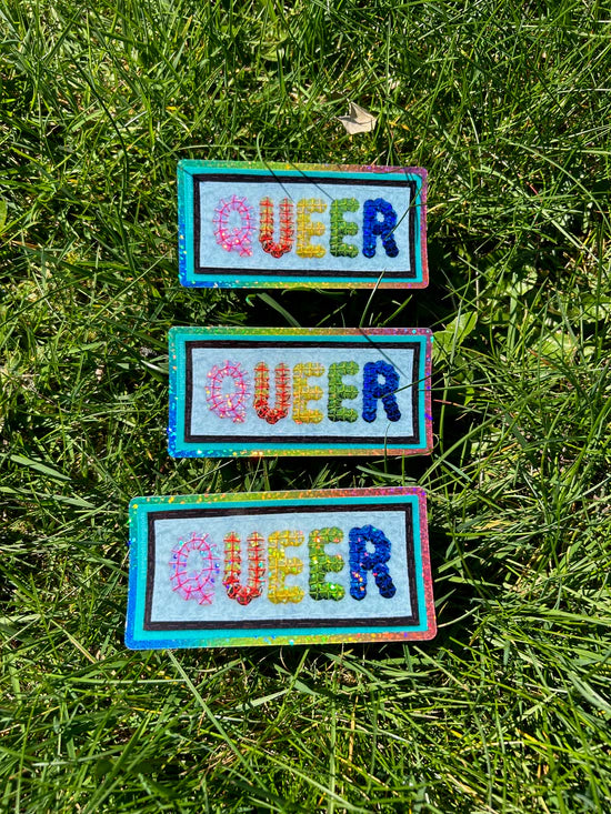 waterproof vinyl sticker of a hand sewn sequin patch that reads "queer"