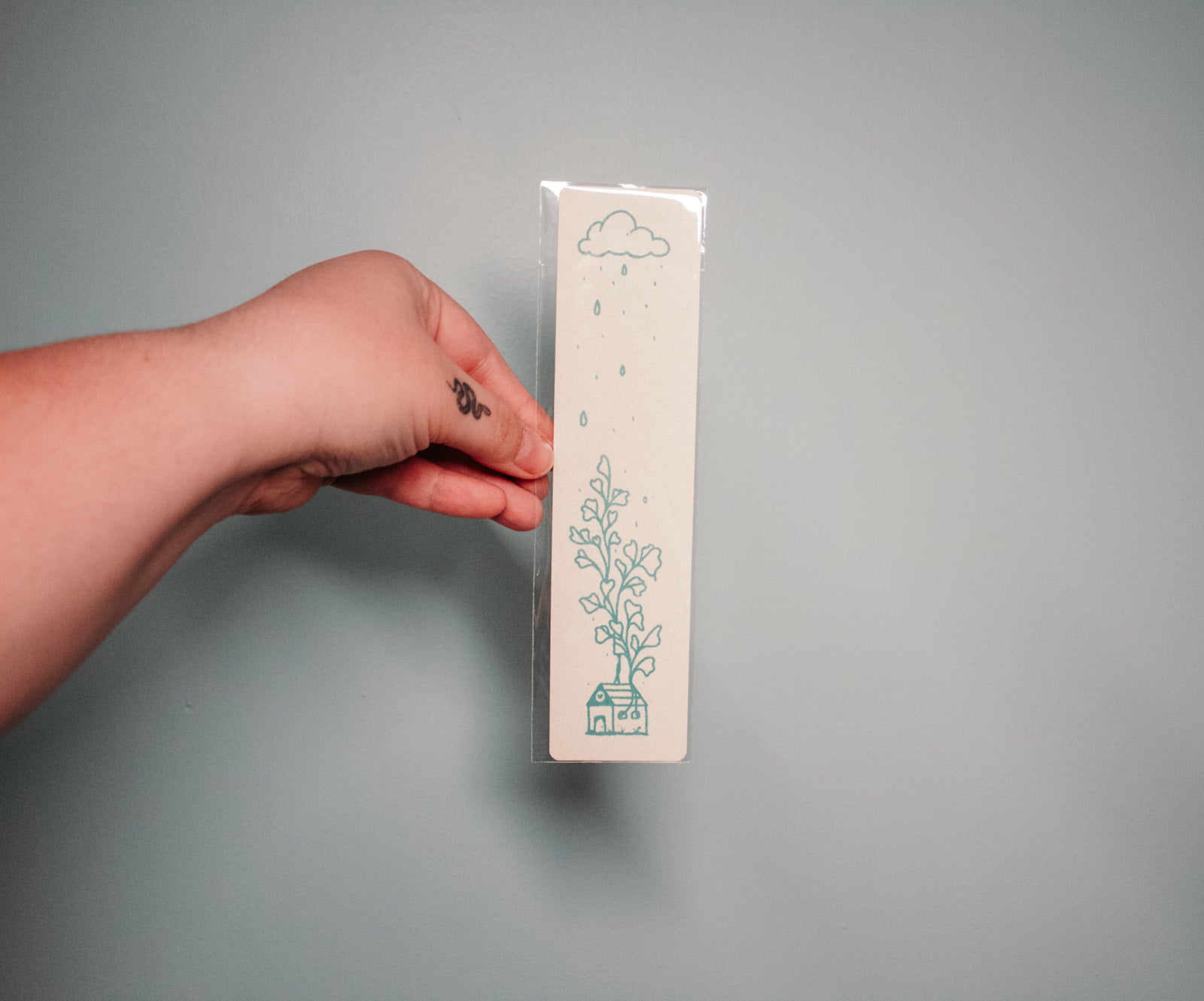 2x8 seafoam riso printed bookmark of a cozy house overgrown with a plant reaching for the rainy cloud above
