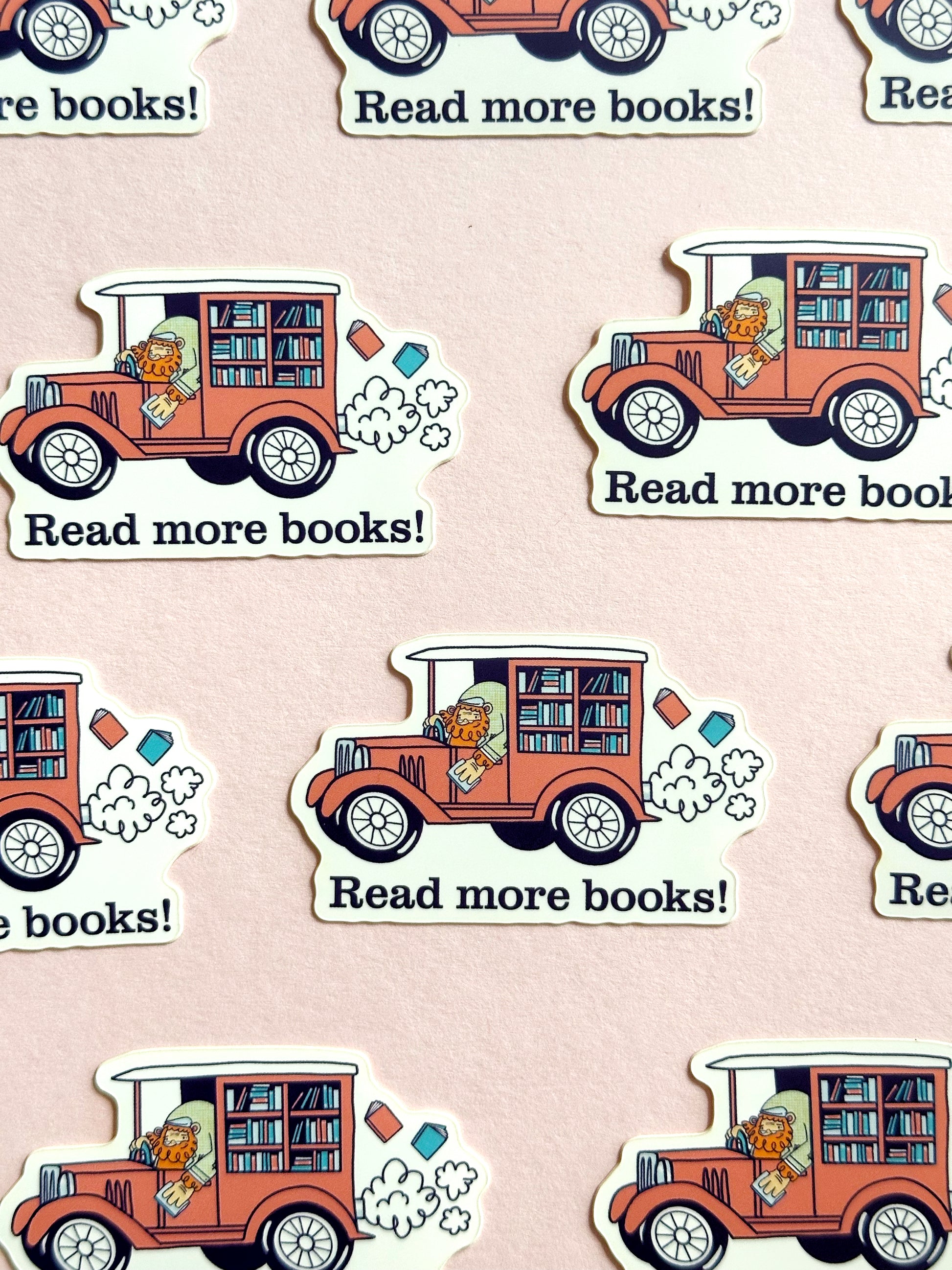 This 3 inch matte vinyl sticker features Cute K.O. 2025 competitor Lichen the Sasquatch behind the wheel of the Bookmobile and the text “Read More Books!” These stickers are coated with a UV resistant laminate and are durable for 5+ years outdoors. They are also waterproof, sun proof, tear proof, dishwasher safe, and microwave safe.