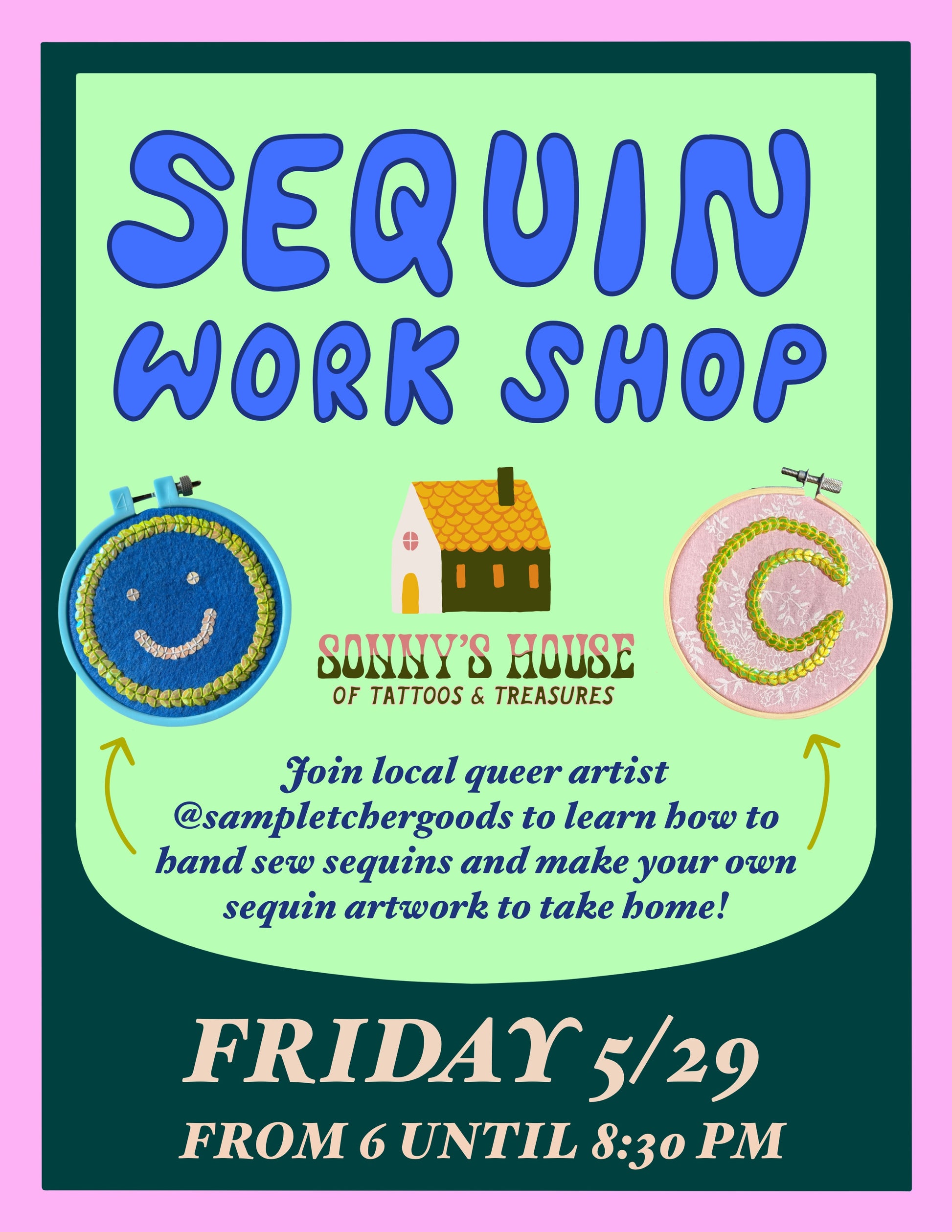 Join local queer artist @sampletchergoods for a sequin 101 workshop! You’ll learn how to hand sew sequins and create your own sequin artwork to take home. Materials are provided so there’s no need to bring supplies, but, if you have fabric or sequins from home that you would like to use for the project, feel free to take them with you to the workshop!