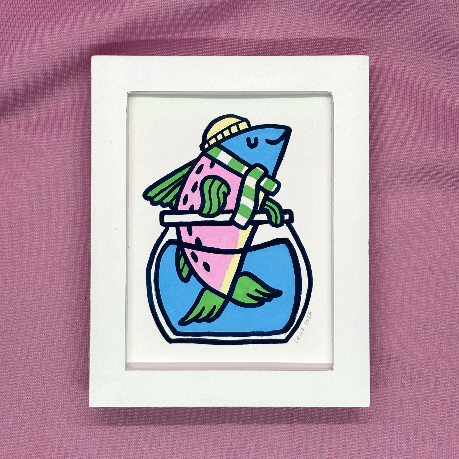 Posca paint pens on vellum bristol board of Cute K.O. 2025 runner-up Slippy the Salmon. Measures 3" x 4" unframed, 3.75" x 4.75" framed
