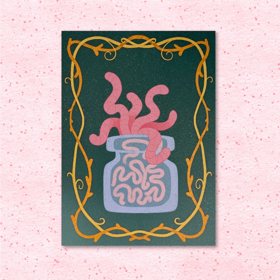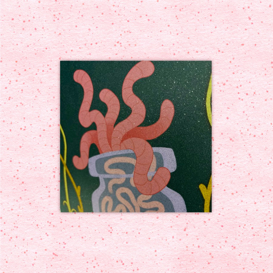 5"x7" Sparkly Worm Potion Print! Printed on metallic flecked paper at the Shrug Studio home base in Portland, OR.