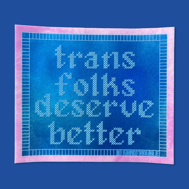 rectangular blue and pink sticker with white text "trans folks deserve better"