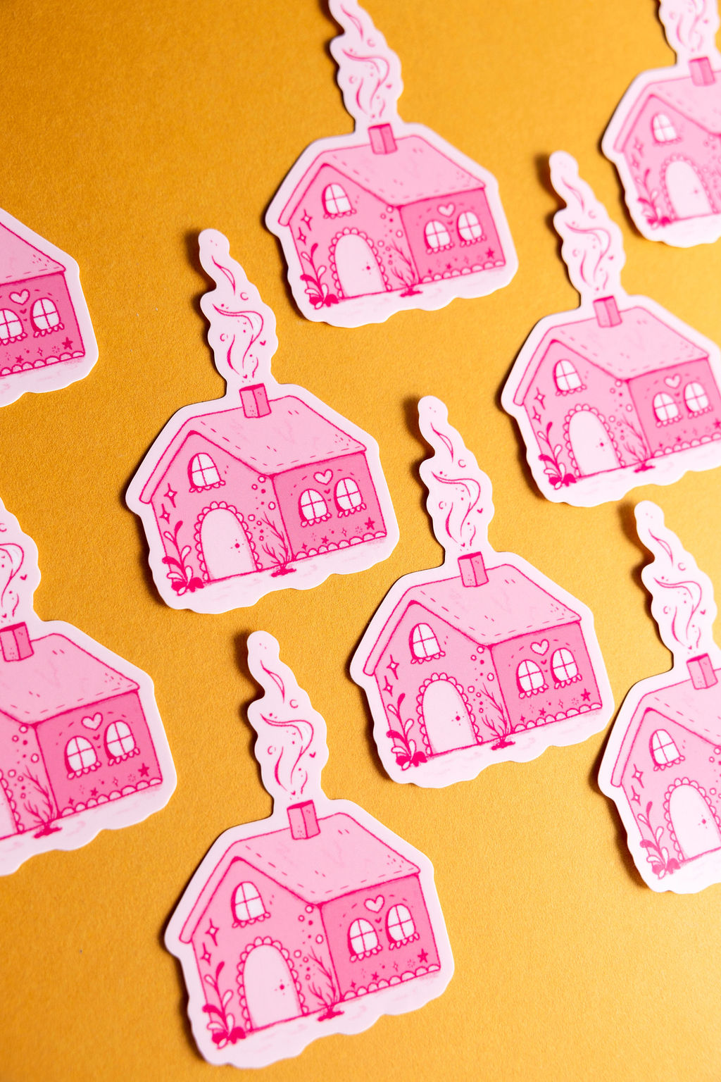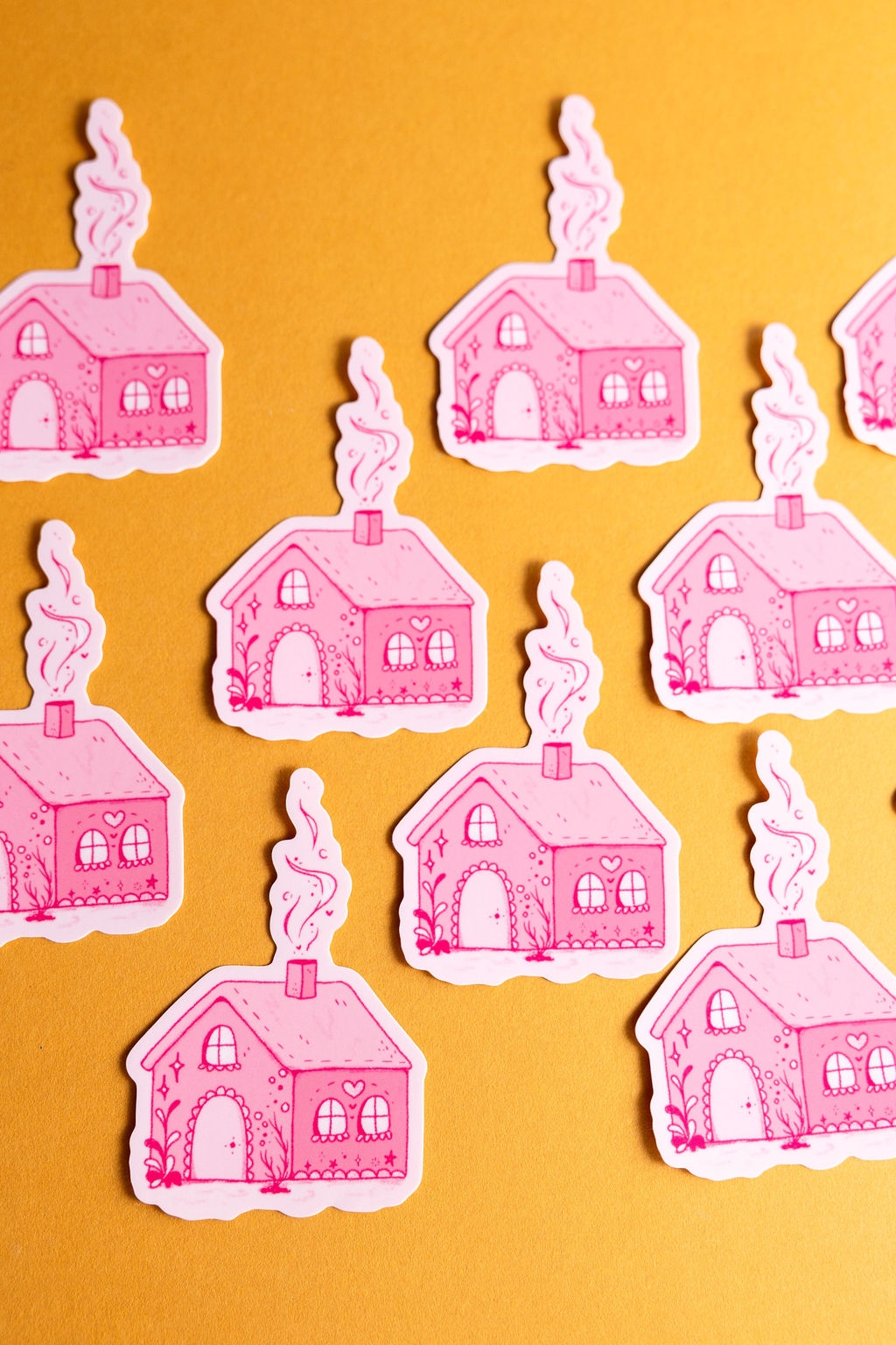 2.5in by 3.5in waterproof vinyl sticker of a pink cozy cottage with whimsical smoke coming from the chimney